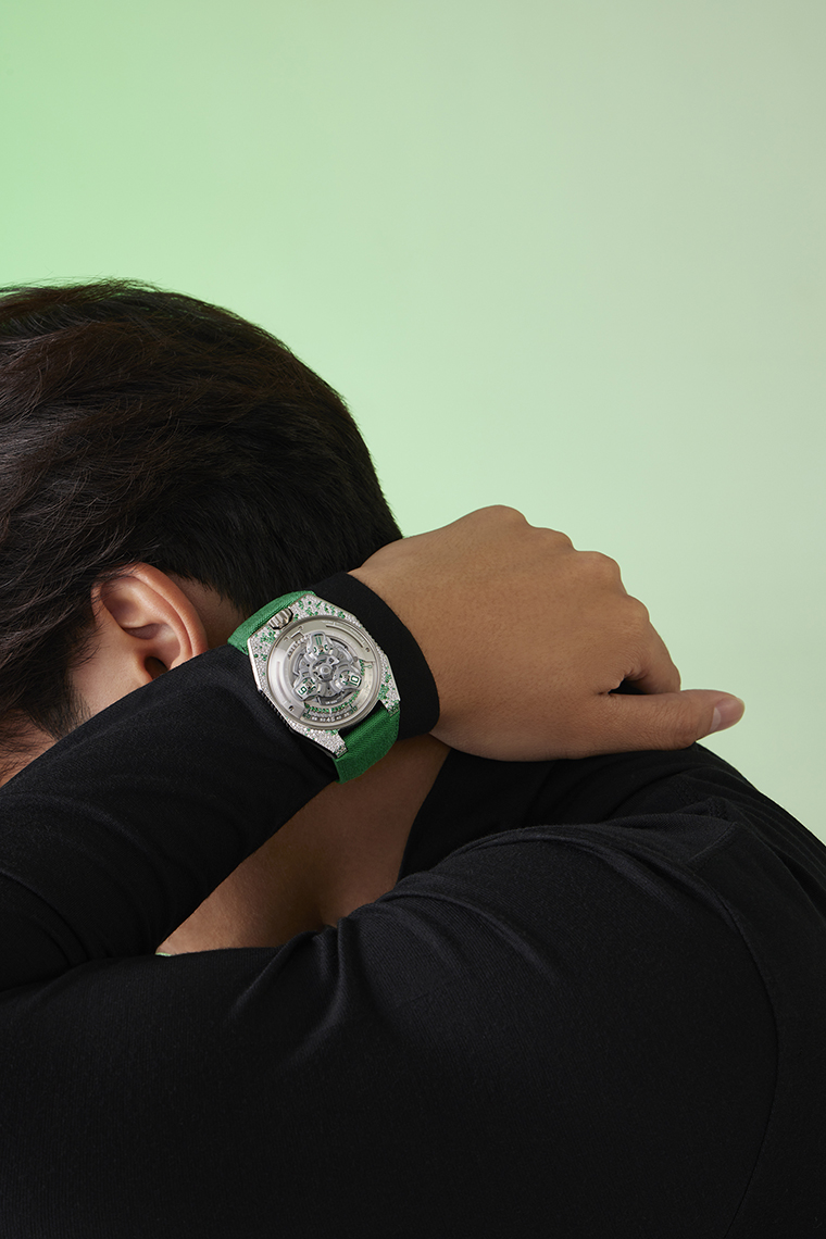 สีเขียว สีแห่งความสงบสุข สื่อถึงความรู้สึกแรกที่ผู้ก่อตั้งแบรนด์ URWERK มาถึงแผ่นดินไทย ความรู้สึกเสมือนได้ก้าวเข้าสู่แหล่งพักพิงอันเงียบสงบและปลอดภัยยังตราตรึงอยู่ในความทรงจำไม่รู้ลืม