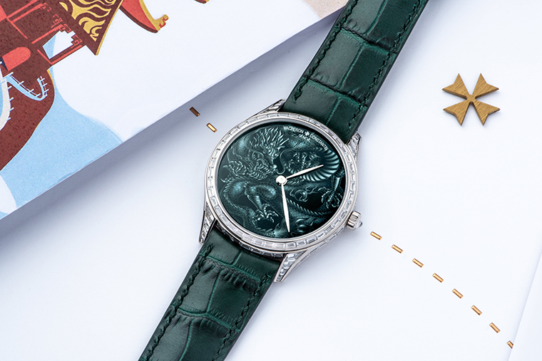 Vacheron Constantin เพิ่มสมาชิกความพิเศษสุดอัศจรรย์สำหรับมหากาพย์การเดินทางนี้ในผลงานรุ่น Les Cabinotiers Grisaille High Jewellery – Dragon (เลส คาบิโนทิเยร์ส กรีแชลล์ ไฮ จิวเวลรี - ดรากอน) ได้อุทิศให้กับจีน ประเทศซึ่งทําการค้ากับ Vacheron Constantin มาอย่างยาวนานนับย้อนกลับไปในปี ค.ศ. 1845 โดยบนหน้าปัดของนาฬิการุ่นนี้ถ่ายทอดภาพของมังกรห้าเล็บและไข่มุก ที่ศิลปินช่างระดับมาสเตอร์ของ Vacheron Constantin ได้สร้างสรรค์ลวดลายด้วยงานลงยา grisaille (กรีแซลล์) สีเขียวที่นับเป็นครั้งแรกของโรงงานการผลิต กับอีกหนึ่งครั้งแรกเช่นกันคือการประดับเพชรของรุ่นเข้ากับหน้าปัดลงยา grisaille ส่วนตัวเรือนของนาฬิกายังประดับด้วยเพชรบาแกตต์คัต 146 เม็ด ทั้งบนขอบตัวเรือน ตัวเรือนชิ้นกลาง และข้อต่อตัวเรือน ขณะที่เพชรเจียระไนเหลี่ยมเกสรนํามาประดับตกแต่งไว้บนเม็ดมะยม นาฬิกาที่ได้รับประกาศนียบัตร Hallmark of Geneva ขับเคลื่อนโดยกลไกจักรกลไขลานอัตโนมัติ คาลิเบอร์ 1120 ซึ่งเป็นกลไกระดับต่านานที่มีความ โดดเด่นจากความบางอย่างมากเพียง 2.45 มม. รวมถึงโครงสร้างแห่งสุนทรียะความสวยงามอันน่า พึงพอใจ โดยบรรจุภายในตัวเรือนไวท์โกลด์ ขนาดเส้นผ่านศูนย์กลาง 40 มม. และหนา 8.9 มม. จับคู่กับสายหนังจระเข้สีเขียวเข้มและหัวเข็มขัดแบบหมุดไวท์โกลด์ประดับอัญมณี