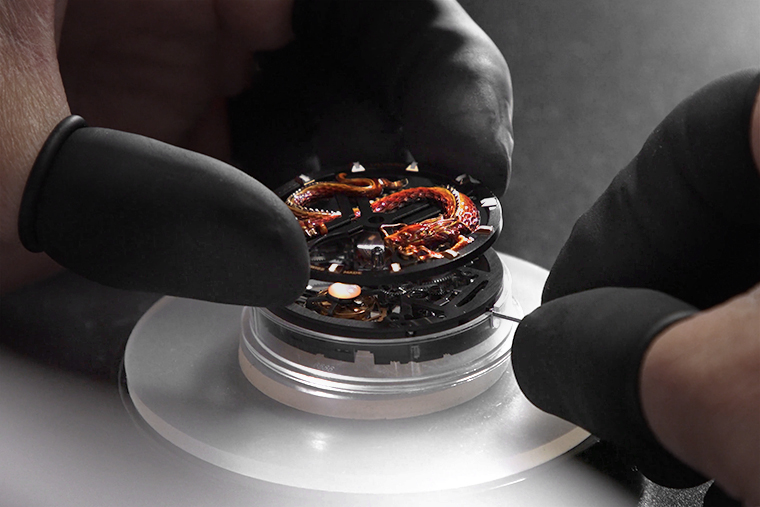การสร้างงานศิลปะของมังกร 3 มิติเคลื่อนที่ลอดใต้ระหว่างเข็มนาฬิกาและเฟืองของโครงสร้างหน้าปัด X ตลอดกระบวนการพัฒนานี้ต้องใช้ระยะเวลานานถึงสองปี เพื่อการออกแบบหน้าปัดที่มีเอกลักษณ์เฉพาะ โดยได้ปรับเปลี่ยนการออกแบบตัวเรือน ขอบหน้าปัด และกระจกคริสตัลแซฟไฟร์ของ Blast Tourbillon ให้มีความพิเศษไม่เหมือนใคร มังกรสีโรสโกลด์ที่แกะสลักและลงสีแบบไมโครด้วยมือทั้งหมด ถือเป็นเครื่องพิสูจน์ความสามารถทางด้านงานศิลปะและทักษะอันยอดเยี่ยม ซึ่งต้องใช้เวลาถึงสี่วันในการสร้างสรรค์ โดยสามวันสำหรับการแกะสลัก และอีกหนึ่งวันสำหรับการลงสีแบบไล่เฉดสีแดง ส้มและเหลืองอย่างบรรจง ในรูปแบบ 3D ได้รับการสร้างแบบจำลองและประดิษฐ์ด้วยความแม่นยำสูงสุด ตั้งแต่เกล็ดหางที่จัดเรียงเป็นระเบียบไปจนถึงหนวดที่แวววาว รวมไปถึงรายละเอียดของกรงเล็บมังกรแหลมคมอีกด้วย
