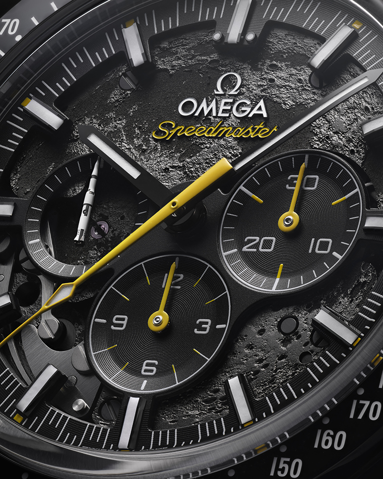 สามารถชมกลไกที่ตกแต่งด้วยดวงจันทร์ได้ผ่านหน้าปัดแบบฉลุของนาฬิกาที่รังสรรค์จากอลูมิเนียมอโนไดซ์สีดำ กระนั้นการเดินทางก็ยังไม่สิ้นสุด สำหรับตัวเรือนขนาด 44.25 มม. ชิ้นส่วนขอบตัวเรือนขัดเงากับฝาหลังของ OMEGA รุ่นนี้จะผลิตจากเซรามิกสีดำหลายชิ้น อีกทั้งเติมเต็มด้วยสเกลทาคีมิเตอร์จากอีนาเมลแบบ “กรองด์ เฟอ” (Grand Feu) สีขาว เข็มโครโนกราฟกลางสีเหลืองเคลือบซึ่งเป็นโทนเดียวกับบนส่วนของสายนาฬิกาแบบฉลุ ซึ่งรังสรรค์จากวัสดุยางสีดำและตกแต่งด้านในด้วยสีเหลือง