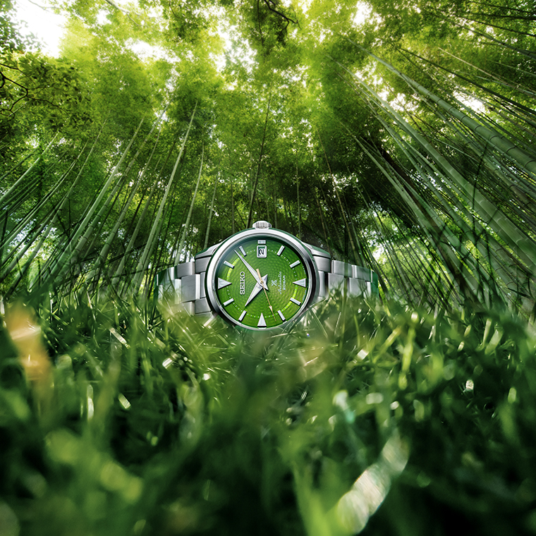 ความโดดเด่นของรุ่น “Seiko Prospex Bamboo Grove Limited Edition” นี้คือหน้าปัดสีเขียวแบมบูซึ่งถูกถ่ายทอด มาจากเฉดสีของยอดอ่อนใบไผ่ที่พริ้วไหวตามสายลมในป่า พื้นหน้าปัดถูกรังสรรค์ด้วยเทคนิคพิเศษ ถอดแบบจากลวดลายคล้ายหัตถกรรมที่เกิดจากการสานไม้ไผ่ ทำให้หน้าปัดดูมีมิติมากขึ้นเมื่อเล่นกับแสง ชุดเข็มทั้ง 3 ถูกออกแบบให้เป็นสีเงินและสีทอง ตัดกับพื้นสีเขียวของใบไผ่ อินเด็กซ์ที่ตำแหน่ง 12, 9 และ 6 นาฬิกา ยังคงดีไซน์ให้คงเอกลักษณ์ของคอลเลกชัน Alpinist ไว้ พร้อมฟังก์ชันหน้าต่างบอกวันที่ที่ 3 นาฬิกา แมตช์คู่กับสายสเตนเลสสตีล มอบลุคแกร่งอย่างลงตัว