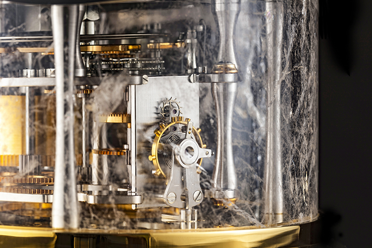 ด้านล่างตัวมังกรคือการทำงานของกลไก PF670 สำหรับแสดงเวลาเป็นชั่วโมงและนาที พร้อมการบังคับไข่มุกให้เคลื่อนที่หนีการตามของมังกรไปพร้อมกับการตีระฆังบอกเวลา สามารถสำรองพลังงานได้นาน 8 ชั่วโมง