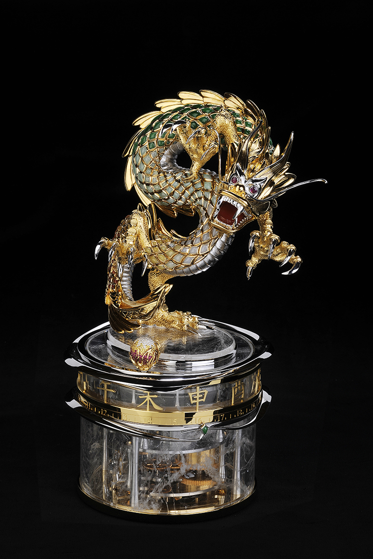 ผลงานศิลปะแห่งเวลาหนึ่งเดียวของมังกรและองค์ความรู้ด้านไข่มุกมีชิ้นส่วนประกอบเกือบ 1,000 ชิ้น และใช้เวลาในการทำงานนานกว่า 5,800 ชั่วโมง โดยความร่วมมือของช่างฝีมือระดับปรมาจารย์ที่มีชื่อเสียงที่สุด ภายใต้การดูแลของ Michel Parmigiani เป็นผลงานที่ทรงคุณค่าและน่าอัศจรรย์อย่างยิ่ง