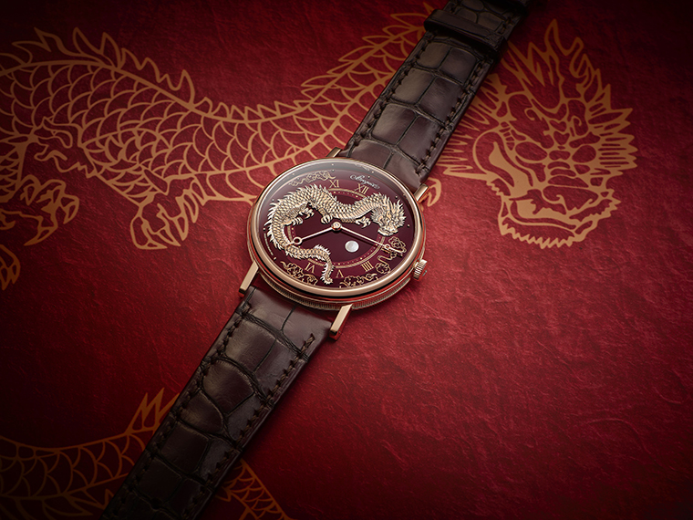 Classique Dragon Ref. 7145 Limited Edition แสดงออกถึงทักษะอันเชี่ยวชาญของช่างฝีมือของ Breguet ผ่านหน้าปัดสีแดงที่ไล่เฉดความเข้มข้นตั้งแต่ริมขอบหน้าปัดไปสู่โทนสว่าง ณ กลางหน้าปัด รังสรรค์ขึ้นจากกรรมวิธีการลงยาแบบ Grand Feu เป็นฉากหลังของมังกรสีทองที่สลักขึ้นอย่างสวยงามในท่วงท่าที่กำลังจับจ้องไข่มุกสีขาวอันเป็นเนื้อมุกธรรมชาติ เติมแต่งรายละเอียดสีทอง ตั้งแต่ ตัวเลขโรมัน มาร์กเกอร์ ลวดลายเมฆ รวมถึงเข็มนาฬิกา ตัวเรือนโรสโกลด์ 40.0 มิลลิเมตร มาความเพรียวบางเพียง 2.40 มิลลิเมตร ภายในทำงานด้วยกลไก in-house อัตโนมัติ Cal. 502.3 ทำงานด้วยความถี่ 21,600 ครั้งต่อชั่วโมง สะสมพลังงานได้นาน 45 ชั่วโมง ประกอบกับสายหนังจระเข้สีน้ำตาลเชสนัท