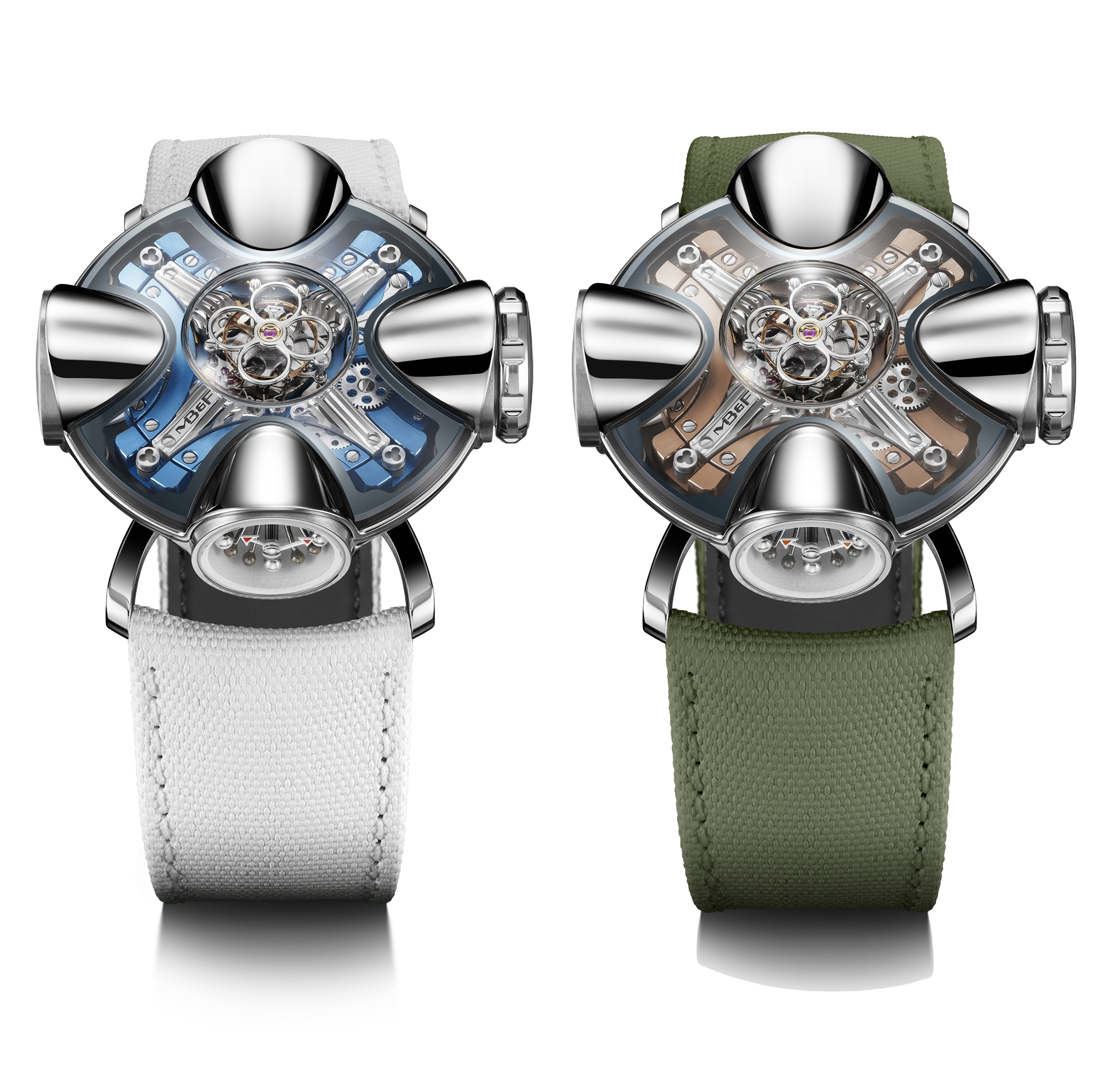 และห้องสุดท้ายที่เหลือดูเหมือนห้องว่างเปล่าสีขาว มีเพียงตราสัญลักษณ์ทรงกลมเล็กๆ สลักด้วยลวดลายขวานรบของ MB&F หลังกระจกคริสตัลแซฟไฟร์ อันที่จริงแล้ว นี่คืออีกคุณสมบัติที่ไม่เคยมีมาก่อนในอุตสาหกรรมการผลิตนาฬิกาคือเม็ดมะยมสำหรับตั้งเวลาแบบมองทะลุได้ ซึ่งมีเส้นผ่าศูนย์กลางเกือบ 10 มิลลิเมตร ความใหญ่และโปร่งใสช่วยให้มองเห็นกลไกได้โดยตรงอย่างไร้สิ่งกีดขวาง เม็ดมะยมในคริสตัลแซฟไฟร์นี้ ปฏิเสธไม่ได้ว่าเต็มไปด้วยความสวยงามน่าอัศจรรย์ แต่ก็มาพร้อมความท้าทายทางเทคนิคที่ต้องเอาชนะ เฉพาะเม็ดมะยมของนาฬิกาต้องติดตั้งปะเก็นที่ช่วยป้องกันฝุ่นและน้ำเข้านาฬิกา ซึ่งเป็นจุดหลักของการเข้าถึงกลไก ขณะที่เม็ดมะยมทั่วไปใช้ปะเก็นที่มีเส้นผ่าศูนย์กลางประมาณ 2 มิลลิเมตร แต่ปะเก็นสำหรับเม็ดมะยมของ HM11 Architect ซับซ้อนกว่านั้นเยอะ เพราะเม้ดมะยมขนาดใหญ่กว่าปกติ 5 เท่า ทำให้เกิดแรงเสียดทานมาก จนทำให้เม็ดมะยมอาจจะหักหรือใช้งานไม่ได้ จึงต้องแทนที่ด้วยการใช้ปะเก็นสองชุดเหมือนระบบแอร์ล็อกสองชั้นในยานอวกาศหรือเรือดำน้ำ โดยขอบด้านนอกของนาฬิกาใช้ปะเก็นที่มีแรงเสียดทานต่ำและมีขนาดใหญ่พอจะปกป้องฝุ่นไม่ให้เข้ามาทางช่องของคริสตัลแซฟไฟร์ ส่วนปะเก็นกันน้ำมีเส้นผ่าศูนย์กลางเล็กกว่ามาก จะติดตั้งอยู่ใกล้กับศูนย์กลางของกลไกที่รอบล้อมแกนเม็ดมะยม และไม่ใช่ปะเก็นชิ้นเดียว แต่ใช้ทั้งหมด 8 ชิ้นเพื่อป้องกันเม็ดมะยมแซฟไฟร์