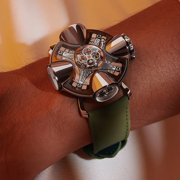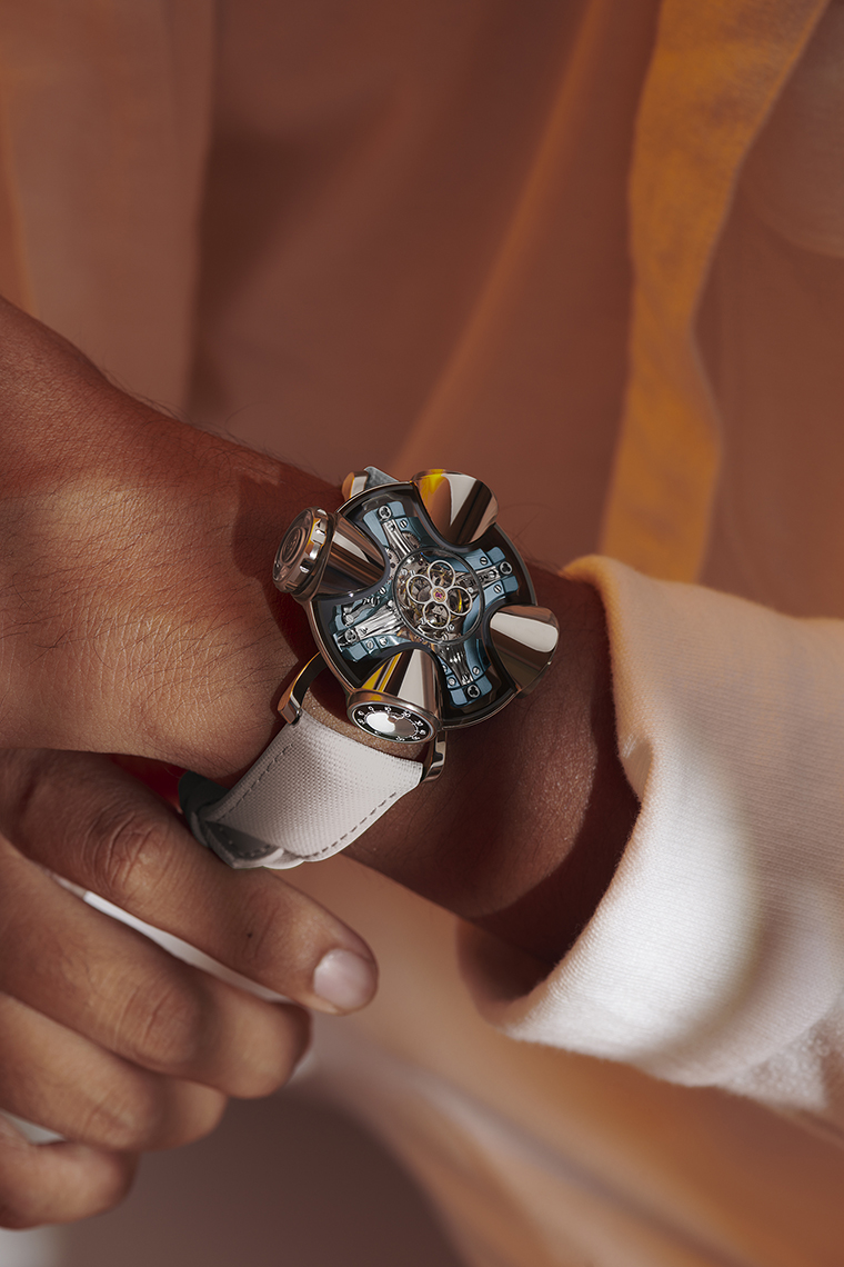 บ้านถูกย่อส่วนเป็นเครื่องจักรบอกเวลาได้อย่างไร? ภาพร่างแรกเฉลยบางส่วน แต่ผลงานเรือนจริงบ่งบอกถึงแรงบันดาลใจที่ส่งผ่านสู่ตัวเรือนซับซ้อนสูงได้อย่างชัดเจน โครงสร้างของตัวเรือน HM11 Architect แบ่งออกเป็น 4 ห้อง ที่คล้ายกับ “ฮับ” หรือ “Pod” โดยมีล็อบบี้ที่โดดเด่นด้วยกลไกฟลายอิ้งทูร์บิญองอยู่ตรงกลางเสมือนหัวใจของบ้าน แกว่งลอยเหนืออากาศภายใต้หลังคากระจกแซฟไฟร์ทรงโดมสองชั้นอย่างเหมาะสม รูปทรงตัวเรือนของ Horological Machine Nº11 Architect เป็นรูปแบบที่ดูสนุกสนาน พองตัวและนูนออก ในขนาด 42.0 มิลลิเมตร และหนา 23.0 มิลลิเมตร โดยประกอบขึ้นจากชิ้นส่วนมากถึง 92 ชิ้น น่าจะเป็นตัวเรือนที่มีชิ้นส่วนมากที่สุดเท่าที่แบรนด์เคยทำมา