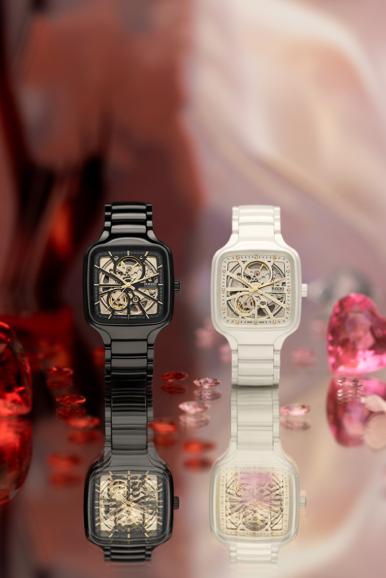 ความหลงใหลของ Rado ในการสร้างสรรค์เรือนนาฬิกาที่สวยงาม พร้อมดีไซน์อันเป็นเอกลักษณ์จากวัสดุที่น่าทึ่งคือความลับที่ทราบกันดี รุ่น True Square Open Heart ที่มาพร้อมดีไซน์แบบ Skeleton เส้นที่คมชัด ช่องหน้าปัดที่เผยให้เห็นกลไกอัตโนมัติ R734 ล้อ เฟือง และการเคลื่อนไหวของ balance spring ที่น่าหลงใหล ซึ่งมาพร้อมกับการสำรองพลังงานถึง 80 ชั่วโมง ทำให้นาฬิกายังคงเดินได้อย่างต่อเนื่อง แม้จะวางนาฬิกาทิ้งไว้ นาฬิการุ่น True Square Open Heart ทั้งสีดำและขาวผลิตจากวัสดุไฮเทคเซรามิกอันเป็นเอกลักษณ์ของ Rado รุ่นสีขาวมีองค์ประกอบสีเหลืองทองและเพชรที่ระยิบระยับ ส่วนรุ่นสีดำจะมีสีโรสโกลด์ที่แวววาวอย่างเด่นชัด และเมื่อรวมกัน ก็จะเป็นนาฬิกาสีขาวและดำเหมือนกับคู่รักที่กำลังเต้นรำกันในวันวาเลนไทน์