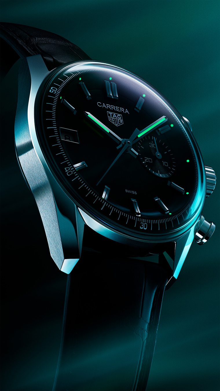 TAG Heuer Carrera Chronograph ผสมผสานความดั้งเดิมและความทันสมัยเข้าด้วยกันอย่างช่ำชอง ในขณะเดียวกัน ก็ยังคงรักษาลุควินเทจอันเป็นเอกลักษณ์ของ Dato ไว้ ทั้งยัง ได้ยกระดับเทคนิคได้อย่างโดดเด่น ทั้งการปรับแต่งตัวเรือนตามหลักสรีรศาสตร์ หน้าแปลนโค้งแบบสง่างาม และหน้าปัดวงกลมขัดเงา ด้วยตัวเรือนที่ทำจากสตีลโดดเด่นด้วยหลักเวลาและเข็มนาฬิกาเคลือบโรเดียม เสริมด้วยหน้าปัดย่อยแบบโมโนสี Teal Green ณ ตำแหน่ง 3 นาฬิกา นาฬิกาประดับกระจกแซฟไฟร์ทรงโดม ซึ่งกระจกทรงโดมโค้งนี้ถูกเรียกว่า "Glassbox" เพื่อเป็นการให้เกียรติต่อดีไซน์คริสตัลเฮซาไลต์ทรงโดมที่คล้ายกันจากปีทศวรรษ 1970 โดยออกแบบใหม่ให้เส้นโค้งพาดผ่านหน้าแปลนได้อย่างไร้รอยต่อ ซึ่งวิ่งไปตามขอบของหน้าปัด ผสานเข้ากับตัวเรือน การออกแบบอันถือเป็นนวัตกรรมใหม่ล่าสุดนี้ทำให้สามารถอ่านค่าบนหน้าปัดได้อย่างง่ายดายผ่านทางกระจกด้านบน