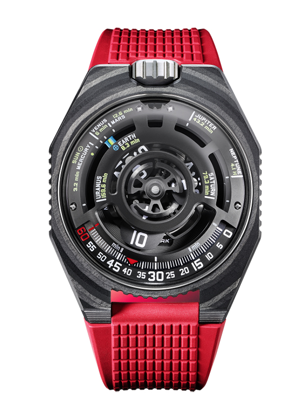 นั่นคือความจริง. รังสีของดวงอาทิตย์ที่ส่องไปถึงดาวเคราะห์ทุกดวงในระยะเวลาที่วัดได้ เตือนถึงช่วงเวลาความงามชั่วคราวของระบบสุริยะ แสงที่เห็นในวันนี้คือเสียงสะท้อนของอดีต ซึ่งถูกแช่แข็งในทันทีทันใดในช่วงเวลาของจักรวาล แสงของดวงอาทิตย์ถึงดาวพุธใน 3.2 นาที ดาวศุกร์ใน 6 นาที โลกใน 8.3 นาที ดาวอังคารใน 12.6 นาที ดาวพฤหัสบดีใน 43.2 นาที ดาวเสาร์ใน 79.3 นาที ดาวยูเรนัสใน 159.6 นาที และดาวเนปจูนใน 4.1 ชั่วโมง . นั่นคือความงามที่รวบรวมมาจาก UR-100V LightSpeed ซึ่งมีการอ้างอิงจากดวงอาทิตย์ ก่อเกิดแรงบันดาลใจในการออกแบบโรเตอร์ด้านหลังของตัวเรือนนาฬิกา