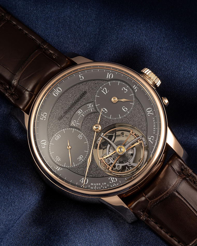 ปลายเข็มนาทีอันงดงามถูกวาดผ่านสเกลนาทีที่วางอยู่รอบนอกของหน้าปัด แต่เนื่องจากสเกลระหว่างนาทีที่ 25 ถึง 35 จะถูกบดบังด้วยกลไก Tourbillon ในส่วนล่างของหน้าปัด แต่ก็ยังสามารถบอกเวลาเป็นรายนาทีได้อย่างแม่นยำด้วยเข็มนาทีแบบสองชั้น ซึ่งเป็นคุณลักษณะพิเศษของ Moritz Grossmann ที่ได้ถูกจดสิทธิบัตรเอาไว้แล้ว