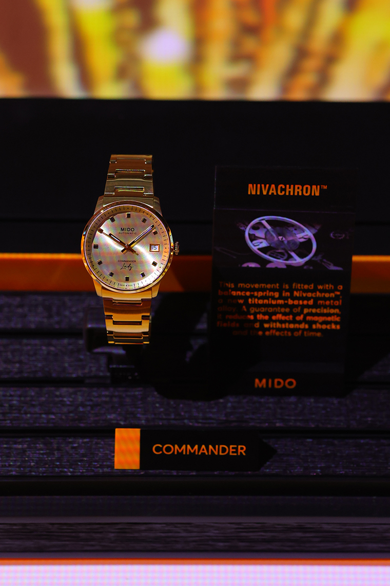 ปิดท้ายที่คอลเลกชั่น “คอมมานเดอร์ เลดี้” (Commander lady) สะท้อนเอกลักษณ์ความเฟมินีน สู่เรือนเวลาดีไซน์เหนือกาลเวลาที่มาในตัวเรือนสแตนเลสสตีลเคลือบ PVD สีเหลืองทองที่โดดเด่น มีขนาดหน้าปัดเส้นผ่าศูนย์กลาง 35 มิลลิเมตร พร้อมการตกแต่งหน้าปัดด้วยการขัดซันเรย์ซาตินรูปทรงเกลียวในโทนสีแชมเปญสุดหรู โดยมีช่องบอกวันที่ (Date) ตรงตำแหน่ง 3 นาฬิกา ครอบทับด้วยกระจกคริสตัลแซฟไฟร์ ขับเคลื่อนด้วยกลไกอัตโนมัติคาลิเบอร์ 72 (Caliber 72) ที่มีบาลานซ์สปริงผลิตจากนิวาครอง (Nivachron™) เพิ่มความแข็งแรงทนทานต่อแรงกระแทกและสนามแม่เหล็ก และสามารถสำรองพลังงานได้ถึง 72 ชั่วโมง พร้อมความสามารถในการกันน้ำลึก 5 บาร์/ 50 เมตร