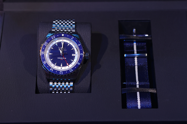 ถัดมาที่คอลเลกชั่น “โอเชี่ยน สตาร์ จีเอ็มที สเปเชียล อีดิชั่น” (Ocean Star GMT Special Edition) นาฬิกาดำน้ำดีไซน์ใหม่ล่าสุดที่ได้เฉลิมฉลองครอบรอบ 80 ปี กับคอลเลกชั่นโอเชี่ยน สตาร์ (Ocean Star) มาในตัวเรือนที่มีการติดตั้งฟังก์ชัน GMT ที่เหมาะสำหรับนักเดินทาง ในหน้าปัดเส้นผ่านศูนย์กลาง 40.5 มิลลิเมตร แสดงเวลาสองไทม์โซนที่แตกต่างกัน ได้แก่ เวลาของเมืองที่เดินทางมา (Home Time) และเวลาของเมืองที่เดินทางมาถึง (Local Time) สำหรับรุ่นสเปเชียล อีดิชั่นครั้งนี้มาในดีไซน์หน้าปัดสีน้ำเงินเข้มอันเป็นเอกลักษณ์ เสริมด้วยการตกแต่งบริเวณหมุดบอกเวลาในรูปทรงฟันปลาฉลามอันแหลมคม พร้อมกรอบเบเซิลอลูมิเนียมสีน้ำเงินเข้มที่สามารถหมุนได้ 2 ทิศทาง ด้านตัวหมุดบอกเวลาและเข็มนาฬิกาเคลือบด้วยสารเรืองแสงซูเปอร์ลูมิโนวา (Super-luminova®) ช่วยอ่านเวลาในยามค่ำคืนหรือบริเวณแสงน้อย มีช่องบอกวันที่ (Date) ตรงตำแหน่ง 3 นาฬิกา ครอบทับด้วยกระจกคริสตัลแซฟไฟร์เคลือบสารกันแสงสะท้อนทั้งสองด้านทรงกลาสบ็อกซ์ โดยตัวกลไกขับเคลื่อนด้วยกลไกอัตโนมัติคาลิเบอร์ 80 (Caliber 80) สามารถสำรองพลังได้สูงสุด 80 ชั่วโมง พร้อมบาลานซ์สปริงที่ผลิตจากนิวาครอง (Nivachron™) เพิ่มความแข็งแรงทนต่อแรงกระแทกและสนามแม่เหล็ก นอกจากนี้ยังมาพร้อมกับสายนาฬิกา 2 สไตล์ ได้แก่ สายแสตนเลสสตีลแบบถักที่มีตัวล็อคแบบพับได้ พร้อมส่วนต่อขยายสำหรับทำกิจกรรมดำน้ำ และสายนาโต้สีน้ำเงินเข้มที่มีความทนทานสามารถสวมใส่ได้ในทุกโอกาส และความสามารถในการกันลึก 20 บาร์ / 200 เมตร
