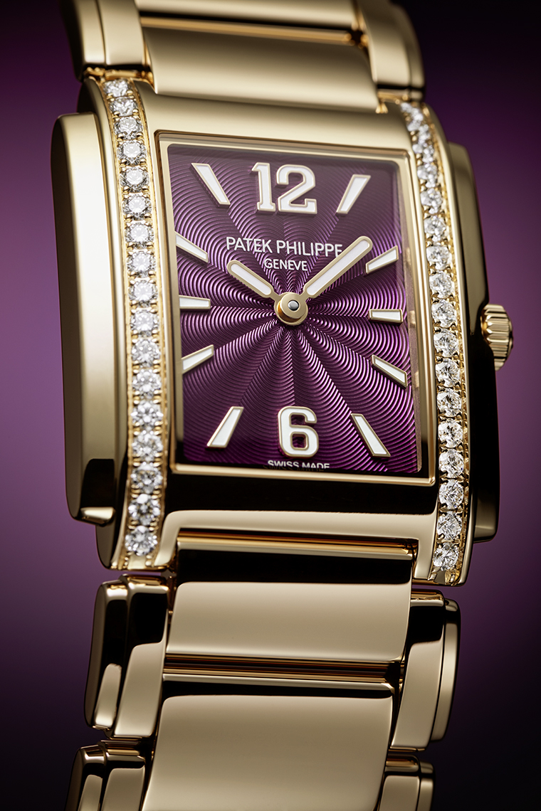 นาฬิกา Twenty~4 ladies’ ในรูปแบบตัวเรือนสตีล ประดับตกแต่งด้วยเพชร ซึ่งเปิดตัวในปี 1999 เป็นคอลเล็กชันแรกของ Patek Philippe ที่อุทิศทั้งหมดให้กับสุภาพสตรี โดยได้รับความสนใจและเป็นที่ชื่นชอบด้วยรูปแบบความสง่างดงามไร้ กาลเวลาที่เหมาะสมในทุกวาระโอกาส ในปี 2018 นาฬิกากลุ่มนี้ได้สร้างสรรค์ออกมาในรูปแบบนาฬิกาควอตซ์โมเดล “manchette” (หรือโมเดลสไตล์ข้อมือ) นำเสนอด้วยตัวเรือนทรงกลมสำหรับนาฬิกา Twenty~4 ladies’ Automatic ใหม่ และเพื่อเป็นการฉลองครบรอบ 25 ปี ของนาฬิกาสุภาพสตรีที่ประสบความสำเร็จและเป็นที่นิยมอย่างยิ่ง Patek Philippe จึงได้นำเสนอเวอร์ชั่นใหม่ของ “manchette” ในโมเดลโรสโกลด์ หน้าปัดที่มีความงดงามประณีตสำหรับนาฬิกา Twenty-4 Reference 4910/1201R-010 สลักลวดลายนูนของคลื่นแบบวงกลม ก่อนที่จะเคลือบด้วยแลคเกอร์ใสหลายชั้นด้วยความละเอียด โดยชั้นแรกจะเป็นการเคลือบด้วยสีม่วงอ่อน จากนั้นจึงเคลือบด้วยสีใสหลายชั้น เพื่อให้เกิดการสะท้อนเห็นแสงและความลึก