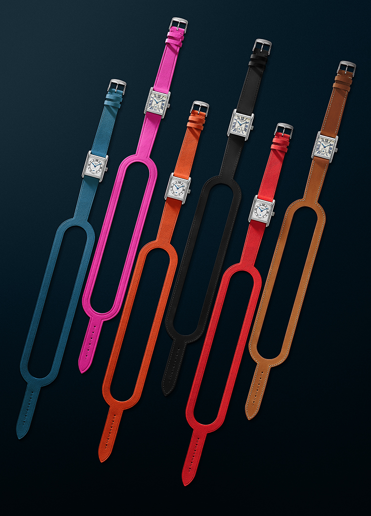 ทั้ง 3 เวอร์ชั่นงดงามด้วยหน้าปัดโรมันสี่เหลี่ยมผืนผ้าสีเงิน มีเอกลักษณ์ด้วยการตกแต่งลวดลาย flinqué ลวดลายเรขาคณิตอันประณีตเหล่านี้ โดดเด่นด้วยมิติสัมผัส คล้ายลายกิโยเช่ (guilloche) ตัวเลขโรมันและเข็มนาฬิกาสตีลสีน้ำเงินเข้ามาเติมเต็มดีไซน์ของหน้าปัดให้สมบูรณ์แบบ หน้าปัดย่อยแสดงวินาทีแบบสี่เหลี่ยมอยู่ที่ตำแหน่ง 6 นาฬิกา สายรัดข้อมือรังสรรค์จากหนังนัปปาดีไซน์แบบพันสองรอบ (double tour) มีให้เลือกหลายสี ทั้งสีดำ, สีทองเบจพร้อมตะเข็บด้ายสีงาช้าง และสีชมพู โดยรุ่นสองสีหลังประดับเพชร Top Wesselton 38 เม็ด