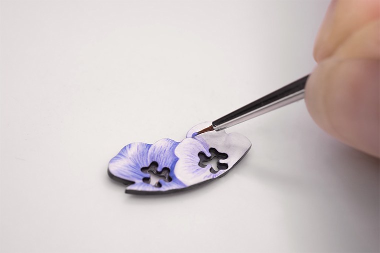 สำหรับหน้าปัดนาฬิกาข้อมือเลดี อารเปลส์รุ่น “สายลมแห่งคิมหันต์” Lady Arpels Brise d’Été ช่างฝีมือจิตรกรลงยาผู้เตรียมพร้อมด้วยการสวมแว่นตาขยายภาพ จะเริ่มลงสีบนกลีบดอกไม้ลงยาลายนูน (vallonné) หรือปีกผีเสื้อลงยาลายฉลุ (plique-à-jour) ด้วยการใช้พู่กันขนมาร์เทิน (marten เป็นสัตว์ชนิดหนึ่งคล้ายพังพอน) บรรจงไล่เฉดตามลำดับน้ำหนักโทนทีละสีลงตามตำแหน่งต่างๆ อย่างแม่นยำโดยอาศัยความประณีต พิถีพิถันระดับสูงจากโทนสีอ่อนสุด หรือสว่างสุดไปจนถึงเฉดเข้มสุด ความยากลำบาก ซึ่งต้องพึ่งพาความเพียรพยายาม และอดทนต่อการใช้เวลาสำหรับแต่ละขั้นตอนของแต่ละสี เพราะหลังจากลงสีไปหนึ่งเฉด ช่างจิตรกรจะต้องนำชิ้นงานไปผ่านกระบวนการความร้อน (ลนไฟ หรืออบในเตาเผา) เนื่องจากสีแต่ละเฉดล้วนมีจุดระเหยก่อตกผลึกก่อประกายเงางามแตกต่างกัน นั่นหมายความว่า ผลลัพธ์ความเป็นเลิศนั้น ย่อมขึ้นอยู่กับประสบการณ์ที่บ่มเพาะความชำนาญ อันอาจกล่าวได้ว่ามีเพียงช่างลงยาระดับปรมาจารย์เท่านั้นจึงจะมีความเข้าใจได้อย่างถ่องแท้