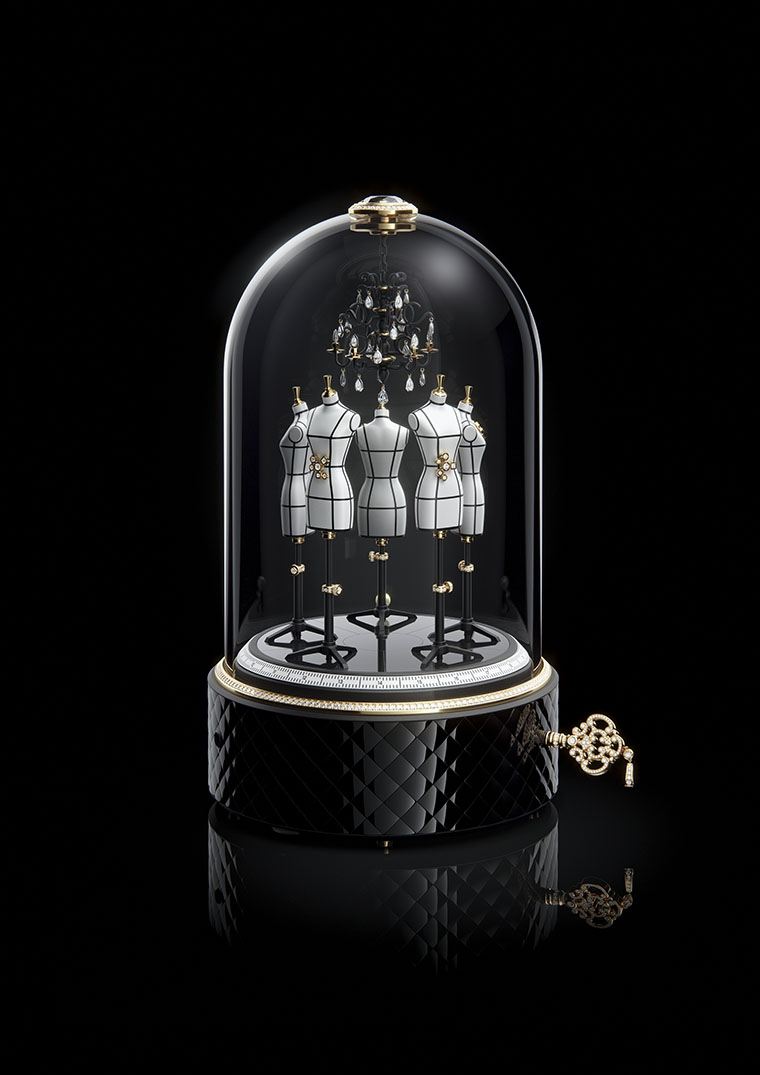 สตูดิโอสร้างสรรค์นาฬิกาของชาเนลนำแรงบันดาลใจจากบรรยากาศอันมีชีวิตชีวาในอาเตอลิเยร์บนถนนกัมบง มารังสรรค์ท่าทางให้กับหุ่นตัดเย็บแบบครี่งตัวตามจังหวะเพลง “My Woman” โดย Al Bowlly ซึ่งเป็นท่วงทำนองที่มาดมัวแซลชอบฮัมเพลงในระหว่างทำงาน โคมระย้าที่มีเพชรทรงหยดน้ำ ฐานที่ได้รับแรงบันดาลใจจากโซฟาบุนวมและการตกแต่งด้วยสีทอง ล้วนทำให้นึกถึงอพาร์ตเมนต์ของกาเบรียล ชาเนลทั้งสิ้น กุญแจไขลานของผลงานอันมีเอกลักษณ์ชิ้นนี้ติดตั้งอยู่บนสร้อยคอโซ่ทองเส้นยาวประดับเพชร ซึ่งมีการแสดงเวลาบนสายวัด นอกจากจะเป็นกล่องดนตรี นาฬิกา และกลไกอัตโนมัติแล้ว ผลงานชิ้นพิเศษนี้ยังรังสรรค์ขึ้นโดยความเชี่ยวชาญของทีมงานช่างฝีมือผู้มีทักษะสูงจำนวนมาก ตั้งแต่เพชรทรงหยดน้ำที่ประดับบนโคมระย้าขนาดเล็ก ไปจนถึงกลไกดนตรีที่ประดิษฐ์ขึ้นอย่างพิถีพิถันและปรับจูนอย่างสมบูรณ์แบบ การสร้างสรรค์ชิ้นงานที่มีเอกลักษณ์เฉพาะตัวนี้ เป็นการผสมผสานระหว่างความซับซ้อนทางเทคนิคและสุนทรียะได้อย่างลงตัว