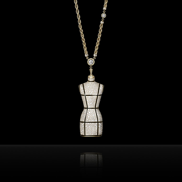 หุ่นจำลองครึ่งตัวสำหรับงานตัดเย็บประดับเพชรระยิบระยับด้วยเทคนิค 'Snow Setting' และเยลโลว์โกลด์ 18K ที่นำเอกลักษณ์ของสร้อยคอยาวมาใช้ หน้าปัดเคลือบแลคเกอร์สีดำซ่อนอยู่ที่เอวของหุ่นจำลอง