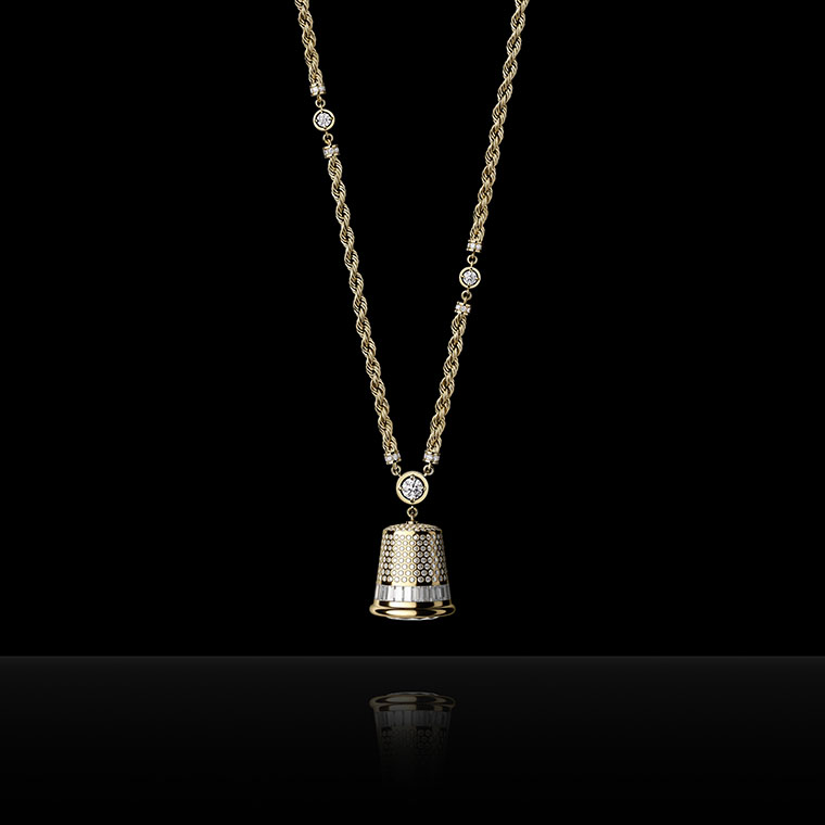 ปลอกนิ้วประดับเพชรระยิบระยับด้วยเทคนิค 'Snow Setting' และเยลโลว์โกลด์ 18K นำเอกลักษณ์ของสร้อยคอยาวมาใช้ โดยซ่อนหน้าปัดประดับเพชรไว้ด้านใน