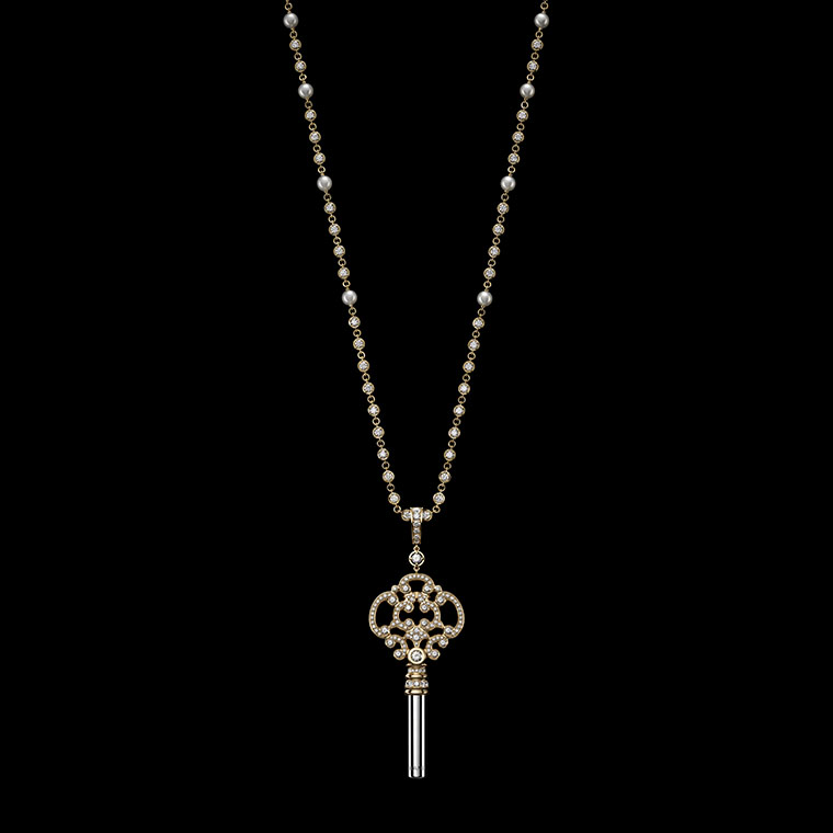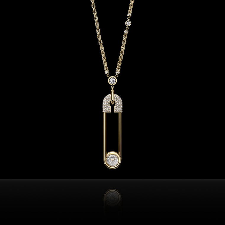 เข็มกลัดประดับเพชรระยิบระยับด้วยเทคนิค 'Snow Setting' และเยลโลว์โกลด์ 18K นำเอกลักษณ์ของสร้อยคอยาวมาใช้ พร้อมแทรกหน้าปัดประดับเพชรไว้ในช่องว่างของเข็มหมุด