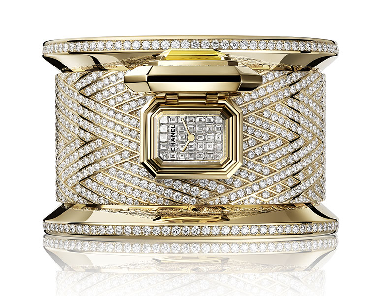 นาฬิกา Première Charms Couture ได้รับการตีความใหม่และประดับด้วยชาร์มรูปหลอดด้าย ปลอกนิ้ว และหุ่นจำลองของมาดมัวแซลที่ทำจากสตีลเคลือบด้วยเยลโลว์โกลด์* และแลคเกอร์สีดำ ชาร์มเหล่านี้ติดอยู่กับสายรัดข้อมือหนังแบบทอที่ชวนให้นึกถึงสายโซ่ของกระเป๋า Chanel สุดคลาสสิก