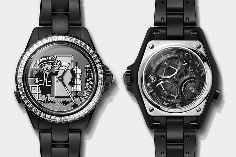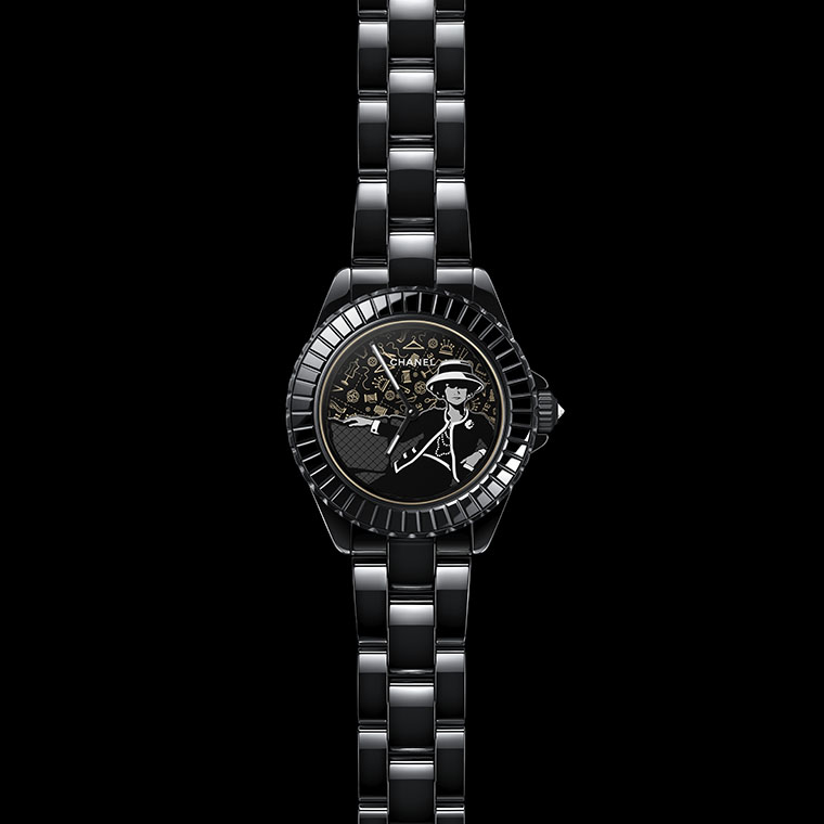 ด้วยแรงบันดาลใจจากกาเบรียล ชาเนล และอาเตอลิเยร์ออกแบบเสื้อผ้าของเธอ ณ ถนนกัมบง สตูดิโอสร้างสรรค์นาฬิกาของชาเนลขอนำเสนอนาฬิกา J12 รุ่นใหม่ที่มาพร้อมหน้าปัดอันมีชีวิตชีวาที่จะเคลื่อนไหวไปตามจังหวะการทำงานในอาเตอลิเยร์ของเธอ หุ่นจำลองมาดมัวแซล ชาเนล กรรไกรในมือ และหุ่นจำลองสำหรับงานตัดเย็บจะเคลื่อนไหวไปพร้อมๆ กันบนฉากหลังอันล้ำค่า นาฬิกาที่โดดเด่นเรือนนี้ประดับด้วยเพชรและมาพร้อมกับคาลิเบอร์ 6 ซึ่งเป็นกลไกใหม่ที่ออกแบบและประกอบโดย CHANEL Manufacture ในสวิตเซอร์แลนด์ ผลงานที่แสดงถึงความสำเร็จทางเทคนิคนี้มีส่วนประกอบถึง 355 ชิ้นที่ทำให้ซิลูเอตของมาดมัวเซลมีชีวิตขึ้นมาได้เพียงแค่สัมผัสปุ่ม ซึ่งตัดกับฉากหลังที่ผ่านการรังสรรค์อย่างพิถีพิถันถึง 5 ชั้น ความสมดุลที่สมบูรณ์แบบระหว่างการออกแบบและทักษะชำนาญการในการผลิตนาฬิกา ได้รับการถ่ายทอดผ่านความเป็นเลิศของวัสดุและความซับซ้อนของรายละเอียดบนนาฬิกาเรือนนี้