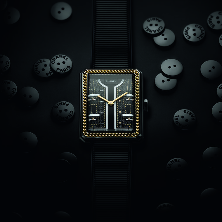 นาฬิกา BOY·FRIEND เรือนนี้มาพร้อมหน้าปัดลายเสื้อแจ็คเก็ตผ้าทวีดอันเป็นเอกลักษณ์ของชาเนล ตกแต่งด้วยกระดุมเพชร 8 เม็ดและขับเน้นด้วยแถบเปียสีเงิน ขอบตัวเรือนตกแต่งด้วยสายโซ่จากทอง 18K ซึ่งชวนให้นึกถึงสายโซ่ที่เย็บเข้ากับชายเสื้อแจ็คเก็ตที่จัดทำขึ้นในอาเตอลิเยร์ของชาเนล