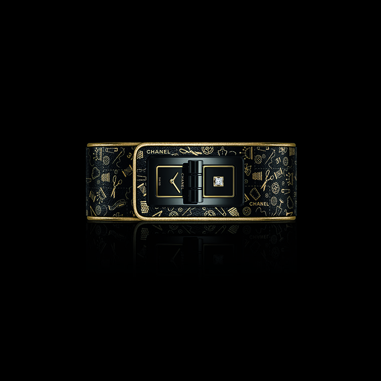 นาฬิกา Code Coco Couture ใหม่มาในดีไซน์ที่มีเอกลักษณ์เฉพาะด้วยสายหนังสีดำและสีทอง พิมพ์ลวดลายปลอกนิ้ว หลอดด้าย และกรรไกร พร้อมหน้าปัดเคลือบแลคเกอร์สีดำแบบสองด้าน โดยด้านหนึ่งประดับเพชรเจียระไนทรงพริ้นเซส