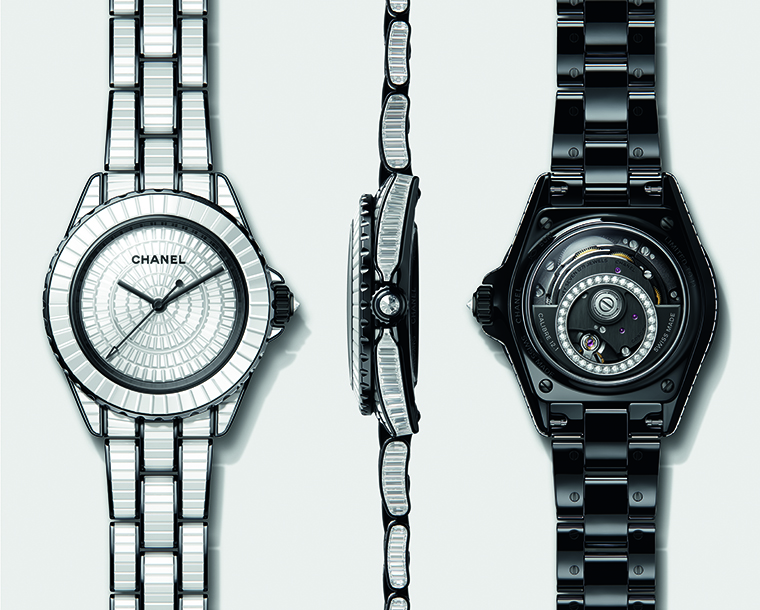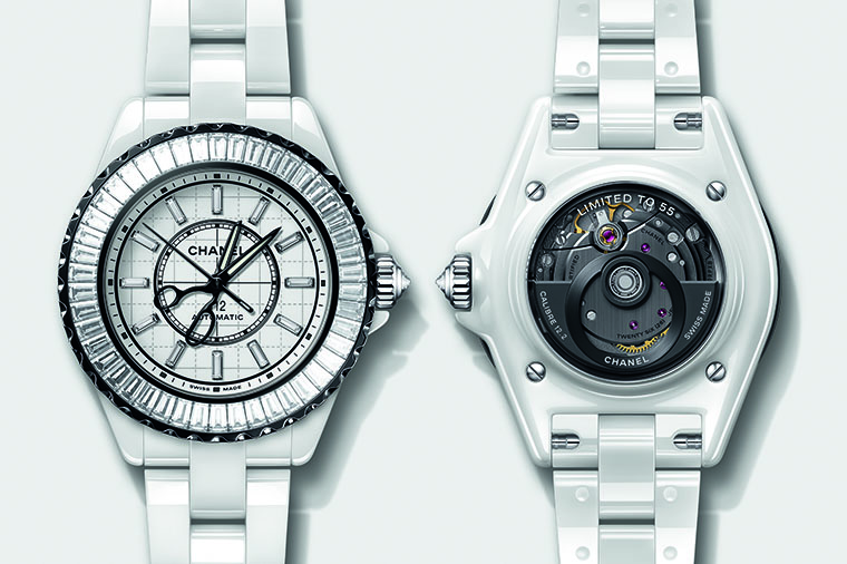 เซรามิกสีขาวเจียระไนทรงบาแก็ตต์แบบล้อมเพชรของนาฬิกา J12 White Star Couture ผลิตจำกัดเพียง 12 เรือน ตัวเรือนสตีลเคลือบสีดำประดับเซรามิกสีขาวเจียระไนทรงบาแก็ตต์ 22 เม็ด และเพชรเจียระไนทรงบาแก็ตต์ 55 เม็ด (~3.58 กะรัต) เส้นผ่านศูนย์กลาง: 38 มม. ทำงานด้วยกลไกกลไกแบบไขลานอัตโนมัติ คาลิเบอร์ 12.1 ผ่านการรับรองความเที่ยงตรงจาก COSC