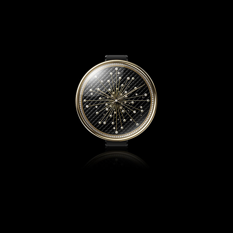 ตัวเรือนไทเทเนียมและเยลโลว์โกลด์ 18K ประดับด้วยชาร์มหุ่นจำลองของมาดมัวแซล ที่ทำจากเยลโลว์โกลด์และแลคเกอร์สีดำประดับเพชร พร้อมลายพิมพ์สายวัดตัวบนสายหนังสีดำและสีทองแบบพับสองทบ