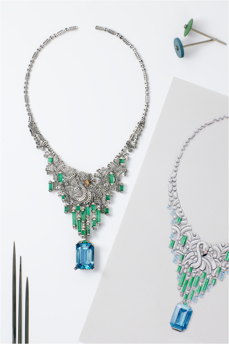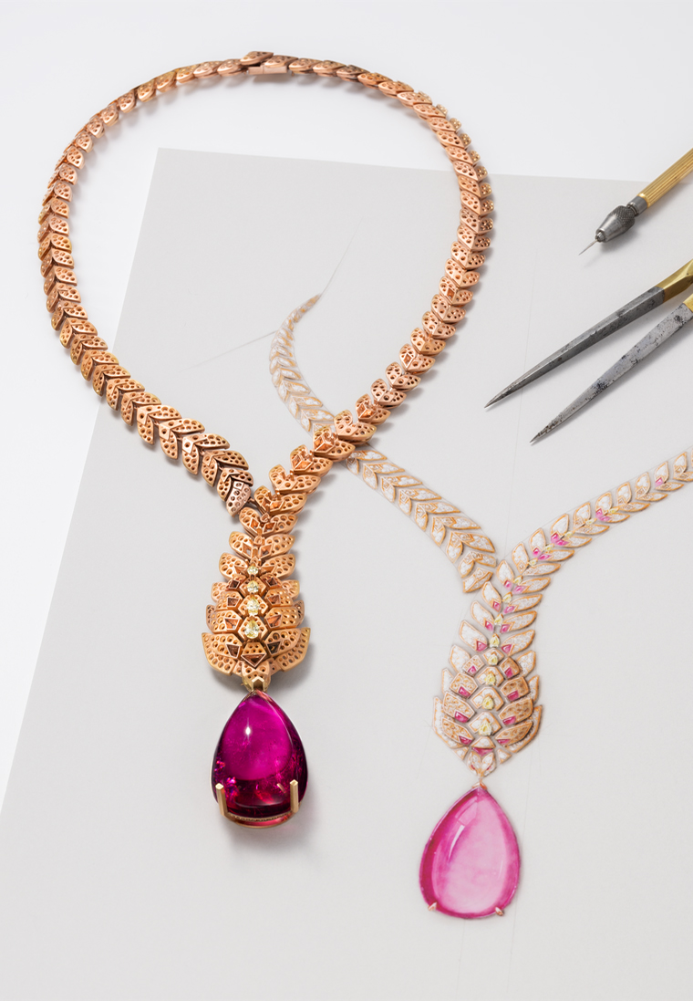 เคลื่อนไหวด้วยจังหวะวิจิตร งูทั้งสองกระหวัดร่างพันเกลียวประดับรอบลำคอ สองร่างทอดเคียงกัน เกล็ดเพชรและมรกตเป็นลวดลาย ทั้งยังประดับเพชรทรงว่าวไว้บนหัว ระหว่างสองร่างคือมรกตแปดเหลี่ยม 9 เม็ด จากโคลอมเบีย น้ำหนักรวม 14.72 กะรัต การจัดองค์ประกอบแบบลูกผสม ผสานความเป็นธรรมชาติกับเสน่ห์ของเมือง ที่เกิดจากการเล่นกับลวดลายเรขาคณิตที่สมบูรณ์แบบ และลวดลายแนวตั้งอันงามสง่า ความสมดุลอันไร้ที่ติระหว่างสองโลก สองพลังที่เคลื่อนไหว ความเจิดจ้าในสีสันของอัญมณี ก่อให้เกิดความสอดพ้องกลมกลืนอย่างสมบูรณ์