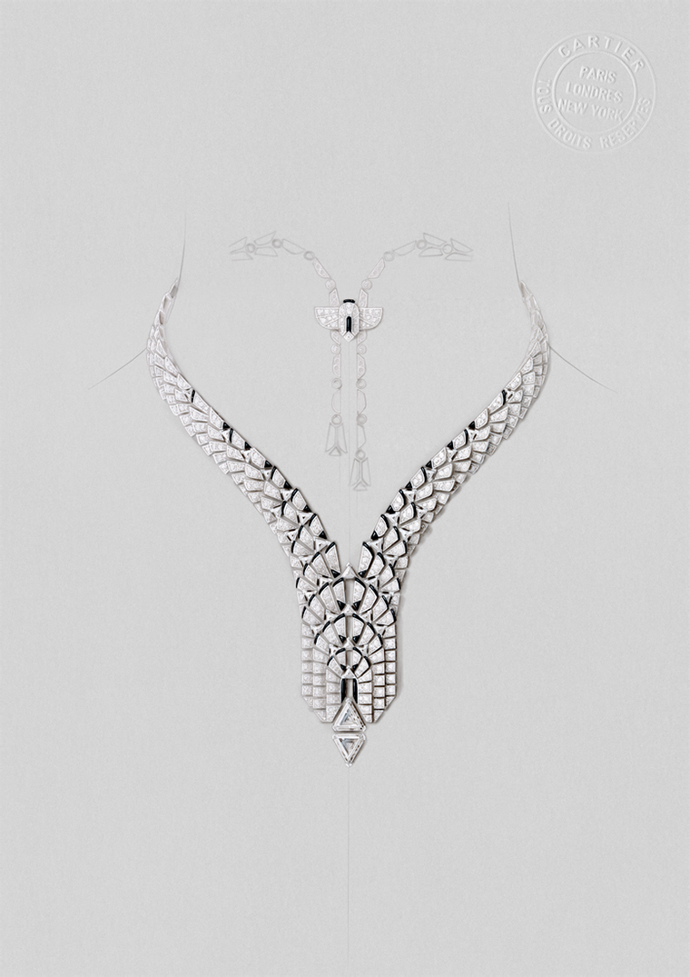 Cartier ร่ายมนต์สะกดทุกประสาทสัมผัส นำเข้าสู่โลกแห่งความหลงใหลละลานตา ไปกับความซับซ้อนของสร้อยคอที่ ออกแบบอย่างชวนเชิญให้จินตนาการถึงซิลลูเอทของตึกระฟ้า เมื่อพลิกไปด้านหลัง จะปรากฏแมลงปีกแข็งประดับอัญมณีเกาะอยู่บริเวณตะขอของสร้อยสุดพราวตา ที่เล่นกับเรขาคณิตและความสมมาตรในสไตล์อาร์ตเดโคผุดตระหง่านขึ้นจากแมลงแสนสวยที่กำลังกระพือปีกก่อเกิดรูปทรงเรขศิลป์ที่เพรียวบาง พร้อมรายละเอียดนับพัน Cartier นำเอาเอกลักษณ์ระหว่างออนิกซ์กับเพชรที่เป็นสัญลักษณ์ด้านสไตล์อันเป็นเอกลักษณ์ของเมซง แล้วนำเข้าสู่ดินแดนอันเลิศล้ำที่ซึ่งความประหลาดใจผสมผสานไปกับจินตนาการ