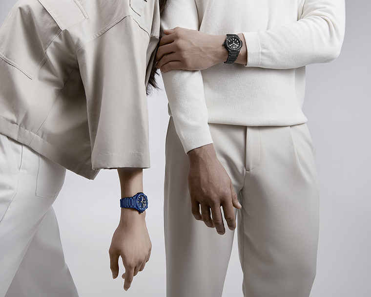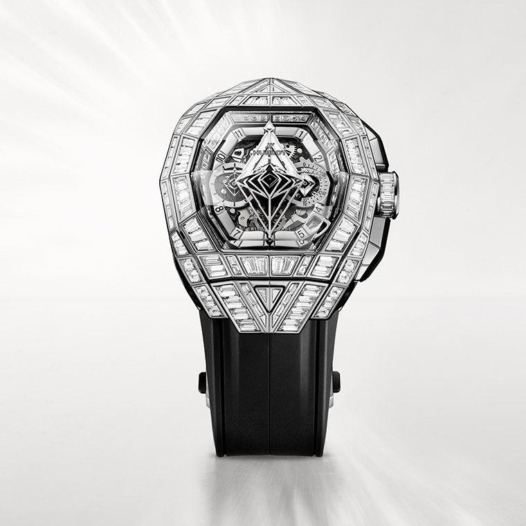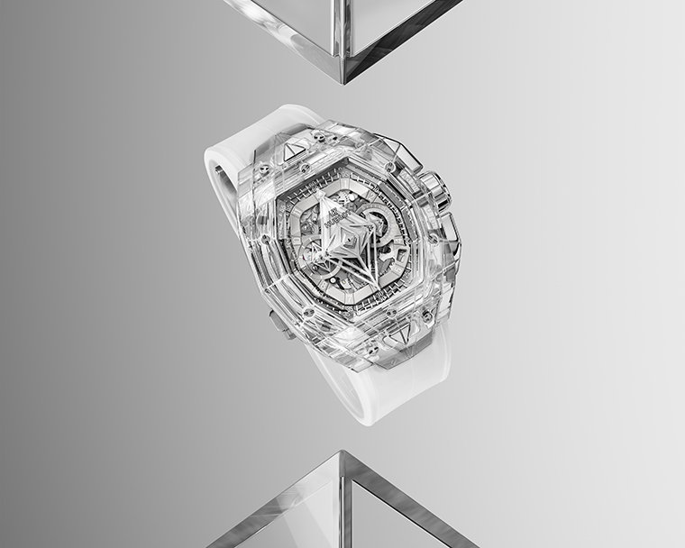 ความร่วมมือระหว่าง HUBLOT และ Maxime Plescia-Buchi ศิลปินผู้สร้างสรรค์รอยสักในนาม Sang Bleu ดำเนินมาอย่างต่อเนื่องเป็นระยะเวลา 8 ปีแล้ว จนในที่สุดปีนี้ ได้มีการเปิดตัวนาฬิการุ่นใหม่ล่าสุด Spirit of Big Bang Sang Bleu Sapphire ตัวเรือนรูปทรงเรขาคณิตสามมิติที่มีเอกลักษณ์อันโดดเด่นอันเกิดจากการดีไซน์เส้นสายโดยศิลปินผู้มีวิสัยทัศน์ ผสานกับการเลือกใช้วัสดุแซฟไฟร์โปร่งใสมาผลิตเป็นตัวเรือนรูปทรงถังเบียร์พร้อมระบบ “One-Click” ผ่านการตัดเหลี่ยมมุมอันประณีตซับซ้อน ซึ่งเมื่อแสงตกกระทบ ก่อให้เกิดมิติที่สวยงามตระการตา ตัวเรือนมีขนาด 42.0 มิลลิเมตร ภายในบรรจุด้วยกลไกสเกเลตันโครโนกราฟไขลานอัตโนมัติ Cal. HUB4700 อันเป็นกลไกที่มีความถี่สูงถึง 36,000 ครั้งต่อชั่วโมง สามารถสะสมพลังงานได้นานราว 50 ชั่วโมง ประกอบเข้ากับสายยางใส ผลิตจำนวนจำกัดเพียง 100 เรือน
