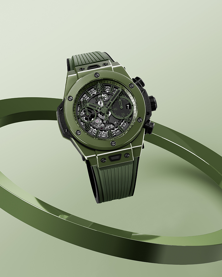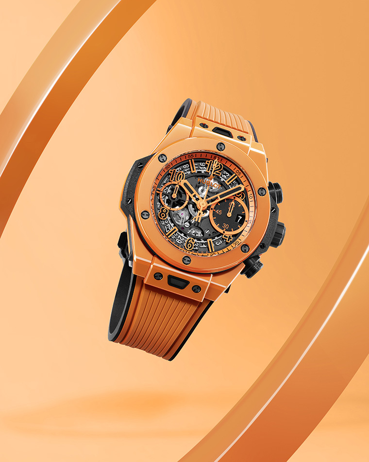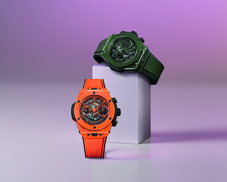 ปีนี้นาฬิกา Big Bang Unico ปรากฏในตัวเรือนวัสดุเซรามิกสีสันใหม่ 2 สีคือสีส้มและสีเขียวเข้ม ผลิตในจำนวนจำกัดสีละ 250 เรือน ตัวเรือนดีไซน์อันเป็นเอกลักษณ์มาในขนาด 42.0 มิลลิเมตร สำหรับรุ่น Big Bang Unico Orange Ceramic ถือเป็นครั้งแรกของอุตสาหกรรมนาฬิกาในการผลิตตัวเรือนด้วยวัสดุเซรามิกสีส้มอันเป็นนวัตกรรมที่คิดค้นโดย HUBLOT ให้สีสันและพื้นผิวที่มีความสดอย่างลงตัว ตัวเรือนและขอบตัวเรือนขัดแต่งอย่างเงางาม ในขณะที่ Big Bang Unico Dark Green Ceramic ในตัวเรือนเซรามิกสีเขียวเข้มมอบลุคที่ดูเข้มแข็งในสไตล์สุขุม นาฬิกาทั้งสองรุ่นมาพร้อมหน้าปัดที่ตกแต่งในแบบ open work เผยการทำงานของกลไก in-house โครโนกราฟฟลายแบ็คอัตโนมัติ คาลิเบอร์ HUB1280 Unico 2 ทำงานด้วยความถี่ 28,800 ครั้ง สะสมพลังงานได้นาน 72 ชั่วโมง สวมใส่คู่สายยางสีส้ม-ดำ หรือสีเขียวเข้ม-ดำ ที่เข้ากับตัวเรือนแต่ละรูปแบบ