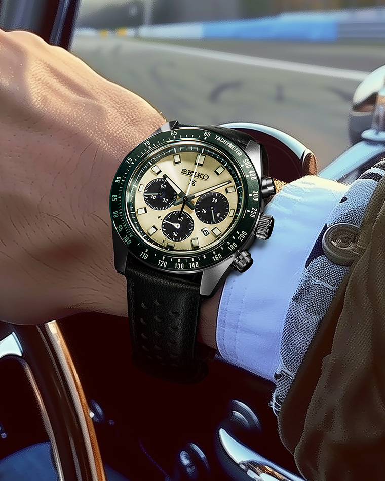 Seiko Prospex Speedtimer Solar Chronograph รหัส SSC943P นาฬิกาสไตล์สปอร์ตวินเทจ ที่ผสานรูปลักษณ์ของหน้าปัดสีแชมเปญที่ตัดกับหน้าปัดย่อยสีดำ และขอบตัวเรือนสีเขียวเข้ม มอบความรู้สึกคลาสสิคได้อย่างน่าหลงใหล พร้อมตอกย้ำอารมณ์วินเทจด้วยการแมตช์เข้ากับสายหนังสีดำคัตติ้งเนี๊ยบ เสมือนแต่ละส่วนประกอบของนาฬิกาจำลองมาจากรถคลาสสิคที่ใช้ประลองความเร็วในการแข่ง Racing Car เป็นรถสีดาร์คกรีนที่ปราดเปรียว มีความคล่องตัวสูง ที่มาพร้อมกับเบาะที่นั่งสีสว่าง ให้อารมณ์วินเทจของยุค 60-70 ร่วมกับพวงมาลัยที่หุ้มด้วยหนังแบบแมตต์สีดำ ช่วยให้ควบคุมการขับขี่ได้ตามต้องการ เป็นการแข่งประชันความเร็วของรถคลาสสิคที่สร้างความเร้าใจได้มากกว่าการแข่งรถ แต่ยังได้ยังได้ชมความสวยงามของดีไซน์อันเป็นเอกลักษณ์จากรถคลาสสิค และโชว์สมรรถนะของเครื่องยนต์ของแต่ละคันอีกด้วย