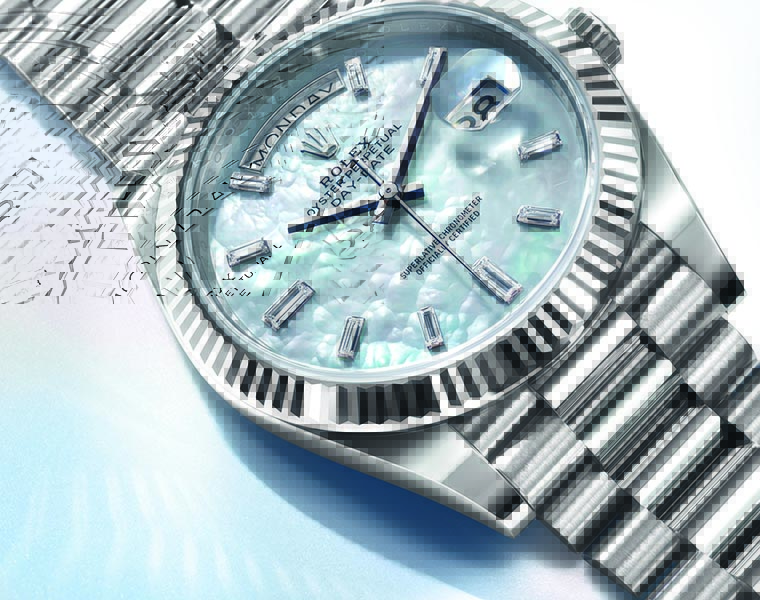 หน้าปัดออมเบรสีฟ้า-เขียว หรือในรูปแบบที่ทําจากเปลือกหอยมุกสีขาวของแท้ ประดับด้วยตัวเลขโรมันแยกส่วนทรงเหลี่ยมพร้อมเครื่องหมายบอกชั่วโมงแบบเหลี่ยมมุม รวมถึงขอบตัวเรือนประดับเพชรทรงสี่เหลี่ยมคางหมู ทั้งหมดนี้ล้วนรังสรรค์ขึ้นสําหรับ Day-Date เวอร์ชันใหม่ อันแสดงให้เห็นถึงปณิธานของ Rolex ที่ต้องการนําเสนอผลงานแห่งความเชี่ยวชาญที่หลากหลายและหายากในทุกรายละเอียด ไม่ว่าจะเล็กน้อยสักเพียงใด ทั้งสีสัน วัสดุ ลวดลาย และเครื่องหมายบอกชั่วโมง ล้วนผสานสร้างความกลมกลืนอย่างลงตัวให้รูปลักษณ์โฉมใหม่