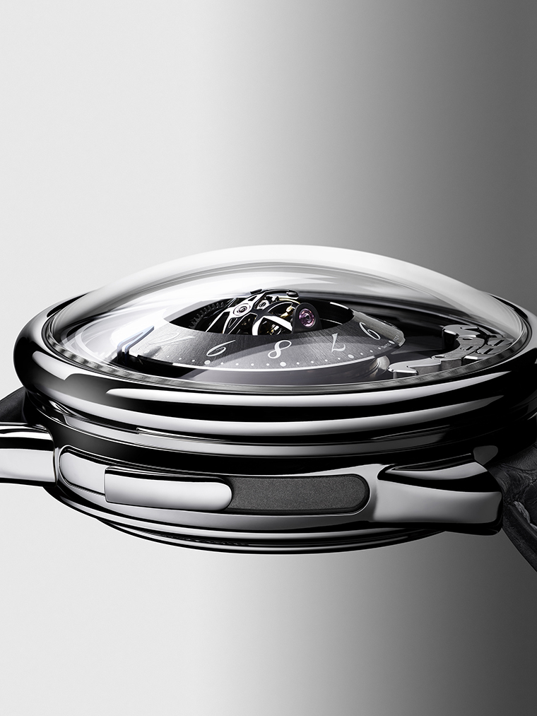 งานสลักตกแต่งกิโยเช่ (guilloché) ที่ชวนให้หวนนึกถึงการแพร่ของคลื่นเสียง ในลวดลายแถบอันทรงพลังของรุ่นไทเทเนียมนั้นสะท้อนถึงรูปทรงของค้อนมินิท รีพีทเตอร์ซึ่งสลักเสลาเป็นดั่งรูปทรงของม้า โดยทำหน้าที่ตีเสียงบอกเวลาชั่วโมง 15-นาที และนาที ที่ควบคุมผ่านตัวสไลด์ซึ่งออกแบบขึ้นเฉพาะและติดตั้งบนด้านข้างของตัวเรือน ค้อนเหล่านี้จะตีลงบนก้านรูปทรงตัว ยู (U) ยืดยาวของฆ้องสตีลเนื้อแข็งขนาดยาวที่สามารถมองเห็นได้รายล้อมรอบขอบของหน้าปัด โดยมีโทนเสียงต่าง ๆ ที่ชวนให้หวนนึกถึงเสียงตีระฆังของโบสถ์ ส่วนโครงสร้าง ‘ส้อมเสียง’ นี้ช่วยให้มั่นใจได้ถึงเสียงสะท้อนอันก้องกังวานมากที่สุด ซึ่งขยายโดยวัสดุซึ่งนำมาใช้สำหรับตัวเรือนที่มีทั้งน้ำหนักเบา และมอบคุณสมบัติด้านเสียงอันล้ำเลิศ