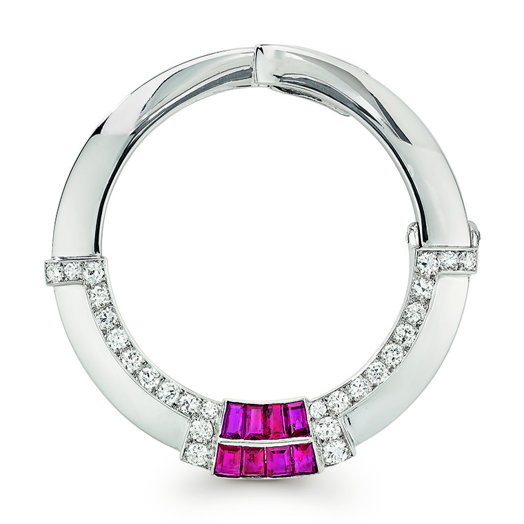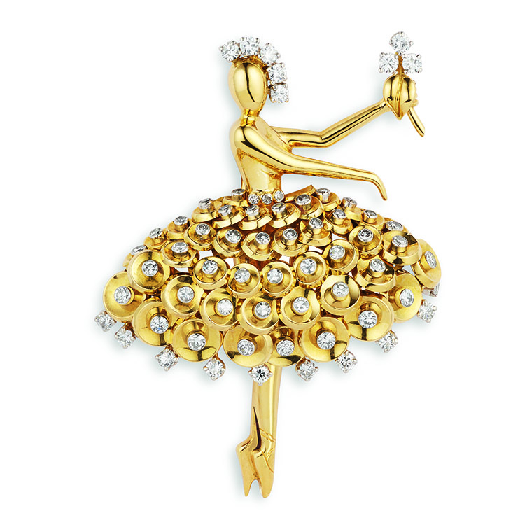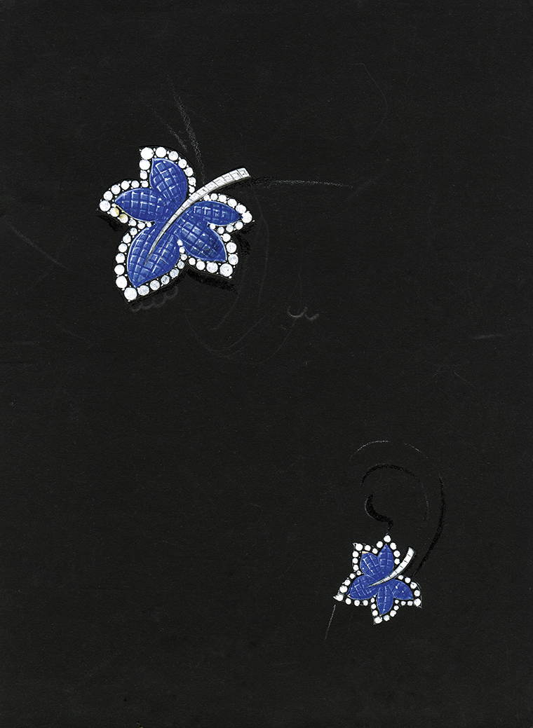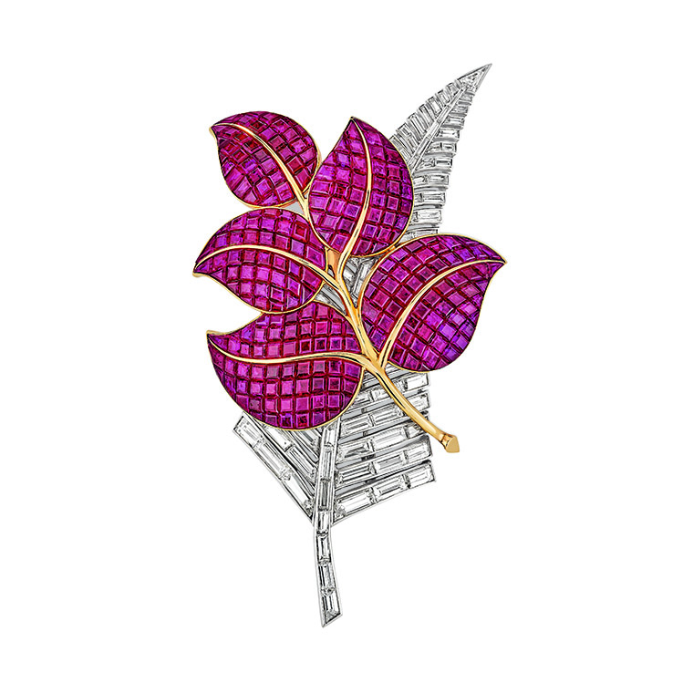 เข็มกลัด “กลีบใบ” (Flower brooch) จากปีค.ศ. 1936 คือผลงานชิ้นสำคัญระดับปรากฏการณ์ในฐานะตัวแทนการเปลี่ยนแปลงอันเกิดขึ้นระหว่างรอยต่อของยุคสมัยในเชิงสุนทรียศิลป์ทางการออกแบบ ลูกเล่นซ้อนใบต่างเฉดสี คือหลักฐานบ่งชี้ว่าความนิยมอันมีต่องานออกแบบดอกไม้ ใบไม้ที่ใช้กับเครื่องประดับสมัยนั้นกำลังเปลี่ยนผ่านจากแนวทางธรรมชาตินิยม ให้ความสำคัญต่อความสมจริงตามธรรมชาติไปสู่รูปแบบอลังการศิลป์หรือ “อาร์ต เดโค” (Art Deco) ซึ่งมีสไตล์เฉพาะตัวด้วยการใช้เหลี่ยมมุมกับรูปทรงเรขาคณิต ดังจะเห็นได้อย่างชัดเจนจากโมทิฟใบไม้รองล่าง ในทางกลับกัน โมทิฟลายลักษณ์ใบไม้ชิ้นบน ก็แสดงให้เห็นว่ากระบวนการพัฒนางานออกแบบก็ยังคงได้รับอิทธิพลอย่างลึกซึ้งจากแนวทางธรรมชาตินิยม และแนวนิยมดั้งเดิมนี้ก็จะดำรงอยู่สืบไปในอนาคตโดยอาศัยเทคนิคใหม่ๆ อย่างเช่นสัณฐานโค้งสมจริงของลายลักษณ์ใบไม้ชิ้นบน ได้รับการทวีความคมชัดด้วยเทคนิคฝังอัญมณีขึ้นตัวเรือนแบบซ่อนหนามเตยหรือ Mystery Set ทักษะในการกลบซ่อน บดบังโครงสร้างโลหะตัวเรือนให้พ้นสายตาอย่างหมดจด และแนบเนียน เทคนิคซึ่งดำเนินการจดสิทธิบัตรครั้งแรกเมื่อปีค.ศ. 1933 นี้ กลายเป็นหนึ่งในสัญลักษณ์หัตถศิลป์มรดกประจำเมซง และได้มีการปรับแต่งให้มีความสมบูรณ์แบบยิ่งขึ้นทางรูปทรงสามมิติในปีค.ศ. 1935 วิวัฒนาการขยายผลครั้งนี้ นำไปสู่การจดสิทธิบัตรครั้งที่สองระหว่างปีค.ศ. 1936 ปีเดียวกับที่มีการสรรค์สร้างเข็มกลัดชิ้นนี้ ด้วยเหตุนั้น นี่จึงนับเป็นหนึ่งในตัวอย่างยุคแรกของกระบวนการพัฒนาระดับปรากฏการณ์ เป็นตัวอย่างแสดงถึงการนำวิวัฒนาการเชิงเทคนิคมาใช้สร้างอัตลักษณ์ หรือลักษณะเฉพาะตัวทางงานออกแบบผลงานชิ้นนี้ เป็นหนึ่งในเครื่องประดับซ่อนหนามเตย ซึ่งมีความเก่าแก่ที่สุดในครอบครองของเรา จึงเหมาะอย่างยิ่งสำหรับใช้เป็นบทสรุปเนื้อหาสำคัญของหนังสือเล่มนี้ เหนืออื่นใด แผนกผลงานมรดกสามารถตามหา และติดต่อซื้อกลับมาตอนที่เราจัดทำรูปเล่ม และภาพประกอบของแค็ตตาล็อกศิลปะพิจักษ์ฉบับแรกเสร็จสิ้นพอดี ดังนั้น เราทุกคนก็เห็นพ้องต้องกันว่าเข็มกลัดชิ้นนี้ควรค่าแก่การขึ้นหน้าปกหนังสืออย่างแท้จริง