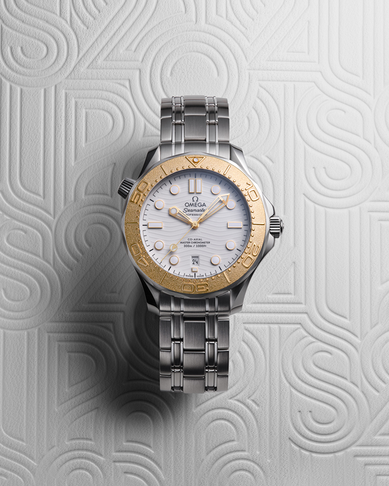 เพื่อเป็นการอุทิศให้แก่เหรียญรางวัลที่นักกีฬาทุกคนล้วนปรารถนา นาฬิกา OMEGA รุ่นนี้จึงรังสรรค์ขึ้นด้วยวัสดุสแตนเลสสตีลและทอง Moonshine™ 18K ซึ่งรายละเอียดที่โดดเด่นที่สุดคือขอบตัวเรือนจากทองคำซึ่งประดับด้วยสเกลดำน้ำที่แกะสลักด้วยเลเซอร์ในรูปแบบยกนูน หน้าปัดที่แกะสลักด้วยเลเซอร์ถูกรังสรรค์จากเซรามิกสีขาว ลายคลื่นที่ยกนูนผ่านการตกแต่งด้วยการขัดเงาสลับด้าน และบนหน้าต่างแสดงวันที่ ณ ตำแหน่ง 6 นาฬิกา OMEGA ก็ได้นำแบบอักษรของ Paris 2024 มาประยุกต์ใช้กับตัวเลขสีดำได้อย่างแยบยล ในขณะที่เข็มวินาทีตรงกลางมีสัญลักษณ์ Paris 2024 ขนาดเล็กทว่าสามารถมองเห็นได้ชัดเจน
