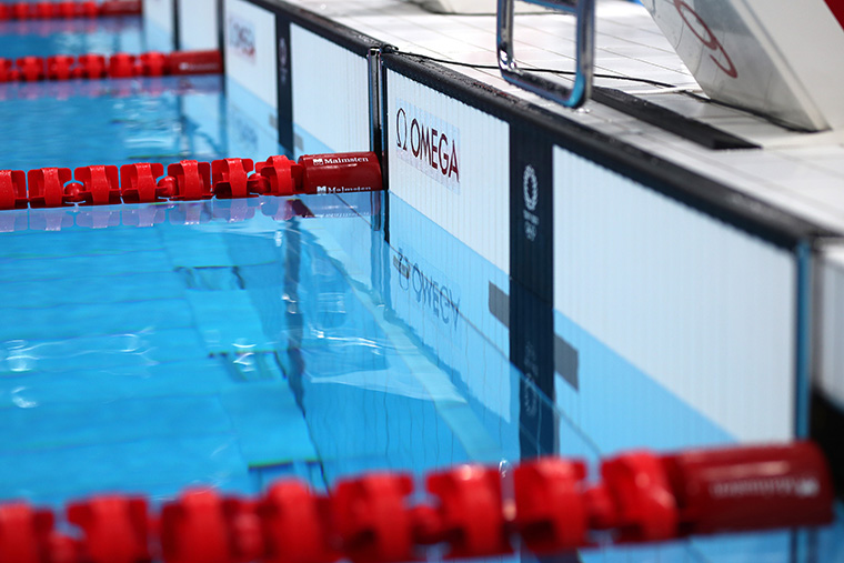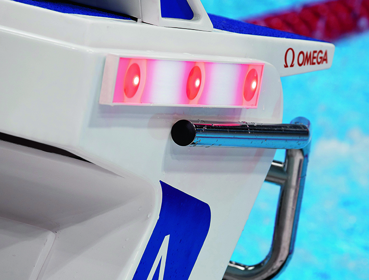 เมื่อสิ้นสุดการแข่งขัน ทัชแพดอันโด่งดังซึ่งถูกติดตั้งไว้ทั้งสองด้านของสระจะทำให้นักว่ายน้ำสามารถ “หยุดเวลา” ได้ด้วยการใส่แรงกดระหว่าง 1.5 ถึง 2.5 กิโลกรัม (3.3 ถึง 5.5 ปอนด์) นี่คือวิธีการที่แม่นยำที่สุดในการวัดเวลาในกีฬาที่ท้าทายเช่นนี้และ OMEGA ก็รับหน้าที่ในการเปิดตัวเทคโนโลยีดังกล่าวครั้งแรกที่มหกรรมกีฬาโอลิมปิกปี 1968 และตั้งแต่ Tokyo 2020 เป็นต้นมา ทัชแพดยังได้รับการใช้งานในกีฬาปีนผาจำลองประเภทความเร็วโดยติดตั้งอยู่ที่ด้านบน