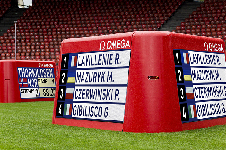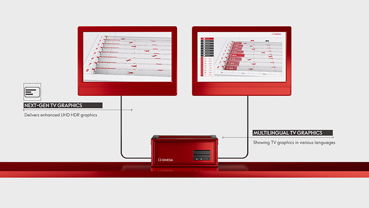 สกอร์บอร์ดความละเอียดสูงของ OMEGA ไม่เพียงจะแสดงข้อความและข้อมูลแบบสด แต่ยังรวมถึงอนิเมชั่น ภาพของนักกีฬา และภาพการคาดการณ์ ด้วยการใช้เอฟเฟ็กต์สมัยใหม่ รายชื่อของผู้ชนะและผลการแข่งจึงถูกแสดงอย่างชัดเจนในทุกการแข่งขัน