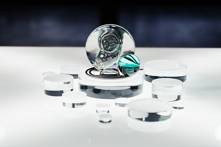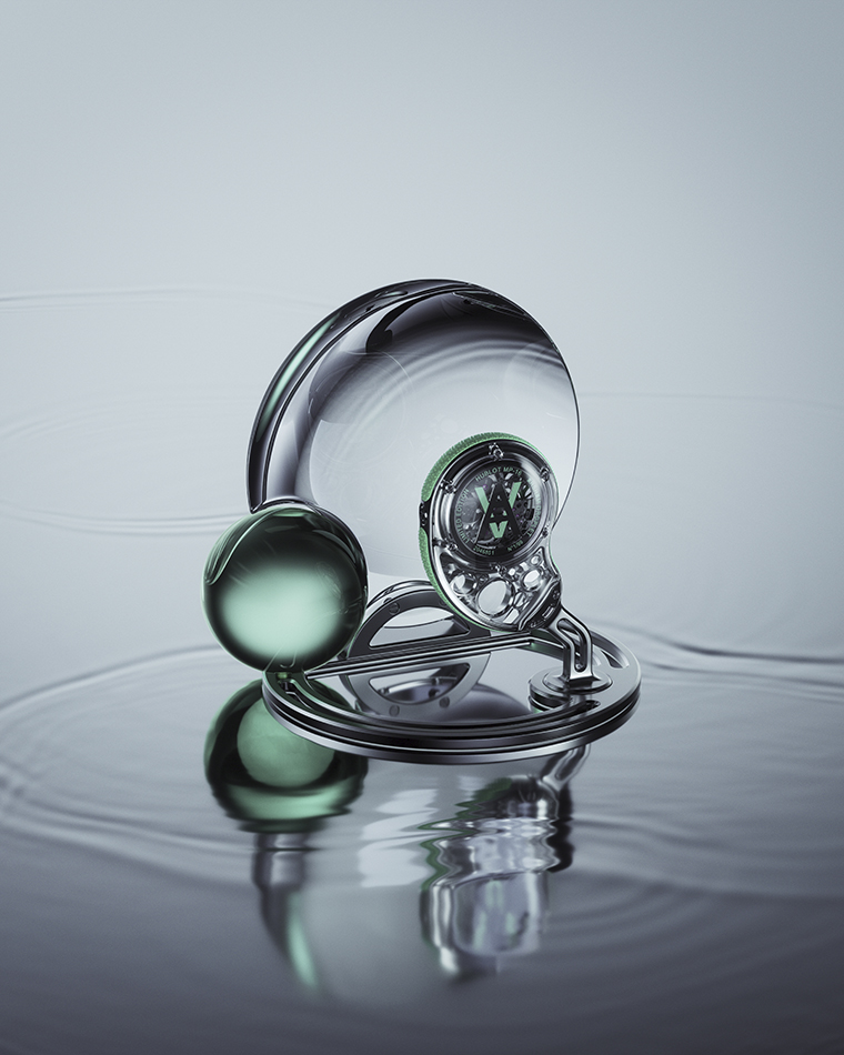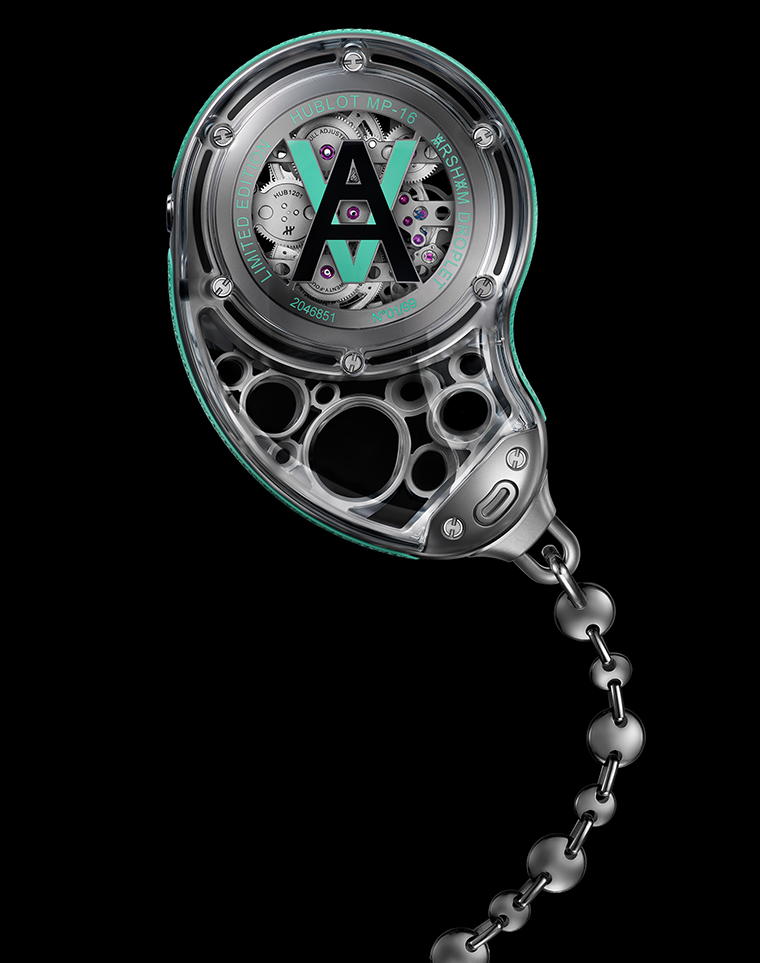 โดดเด่นด้วยโครงสร้างแบบแซนวิชของคริสตัลรูปทรงหยดน้ำทรงโดมที่ประดิษฐ์อย่างประณีตสองชิ้น ตัวเรือนไทเทเนียมแบบโอเพ่นเวิร์คที่มีลักษณะคล้ายลูกไม้ที่ถักทอเป็นรูปหยดน้ำอย่างประณีต ขอบกันกระแทกด้านข้างทำจากยางสีเขียว Arsham Green อันเป็นเอกลักษณ์ประดับอักษรย่อของศิลปินบนพื้นผิว