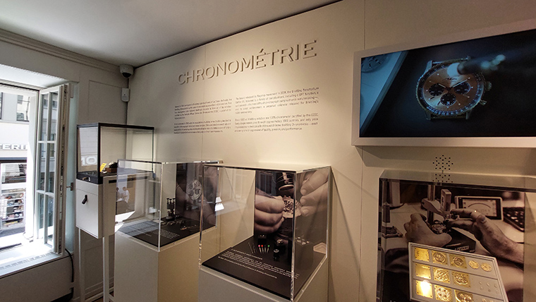 ภายในอาคารสองชั้นของ Breitling Then & Now Pop-up Museum แบ่งการจัดแสดงออกเป็นโซนต่างๆ ประกอบด้วย Time Tunnel จุดเริ่มต้นของในเมือง Saint-Imier ในปี 1884 ก่อนที่ Leon Breitling จะย้ายบริษัทไปยังบ้านเกิดของเขาใน Chaux-de-Fonds เมืองที่ได้ชื่อว่าเป็นดินแดนศูนย์กลางการผลิตนาฬิกาของสวิตเซอร์แลนด์ และคงอยู่มาจนถึงทุกวันนี้ เบื้องหลังประตูทางเข้าพิพิธภัณฑ์แบ่งโซนพื้นที่จัดแสดงออกเป็นส่วนสำคัญต่างๆ เริ่มจากประวัติศาสตร์เริ่มต้นของแบรนด์ที่ใช้ภาพเคลื่อนไหวของ Léon Breitling มาบอกเล่าผ่านจอภาพ ให้ฟังและอ่านประวัติศาสตร์ที่นำเสนอให้เข้าใจง่าย โดยแบ่งแต่ละช่วงปีอย่างขัดเจน พร้อมกับนาฬิกาวินเทจตั้งแต่รุ่นแรกของแบรนด์และรุ่นสำคัญในแต่ละปี ที่แสดงถึงพัฒนาการของความคิดสร้างสรรค์ทั้งในเชิงกลไกและงานออกแบบ เรียกว่าเป็นมุมที่ทำให้เห็นถึงการเปลี่ยนแปลงของนาฬิกาได้อย่างน่าสนใจ จากนั้นก็จะเข้าสู่จักรวาลของ Breitling ที่แบ่งออกเป็น Air, Sea, Land และ Chronometrie บอกเล่าเรื่องราวที่เข้าใจง่ายและสนุกไปกับกิจกรรมต่างๆ ที่เตรียมไว้ภายในพิพิธภัณฑ์แห่งนี้