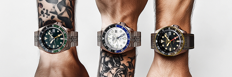 Seiko 5 Sports SKX Series GMT รหัส SSK033K / SSK035K / SSK036K มาพร้อมกลไกอัตโนมัติ คาลิเบอร์ 4R34 ในรูปทรงตัวเรือน SKX ที่ประดับเม็ดมะยมไว้ข้างตำแหน่ง 4 นาฬิกา ชุดเข็ม หลักชั่วโมง และเข็ม GMT เคลือบสารเรืองแสงรูมิไบร์ทที่สามารถช่วยให้การอ่านค่าในที่มืดนั้นทำได้ง่ายขึ้น บนขนาดตัวเรือน 42.5 มม. พร้อมหน้าต่างแสดงวันที่ที่ตำแหน่ง 3 นาฬิกา บนวัสดุตัวเรือนและสายสเตนเลสสตีลสไตล์จูบิลี่ (SSK033K และ SSK035K) และสายหนังลูกวัวอย่างนิ่ม (SSK036K) พร้อมประสิทธิภาพการกันน้ำเทียบเท่า 100 เมตร (10 บาร์)