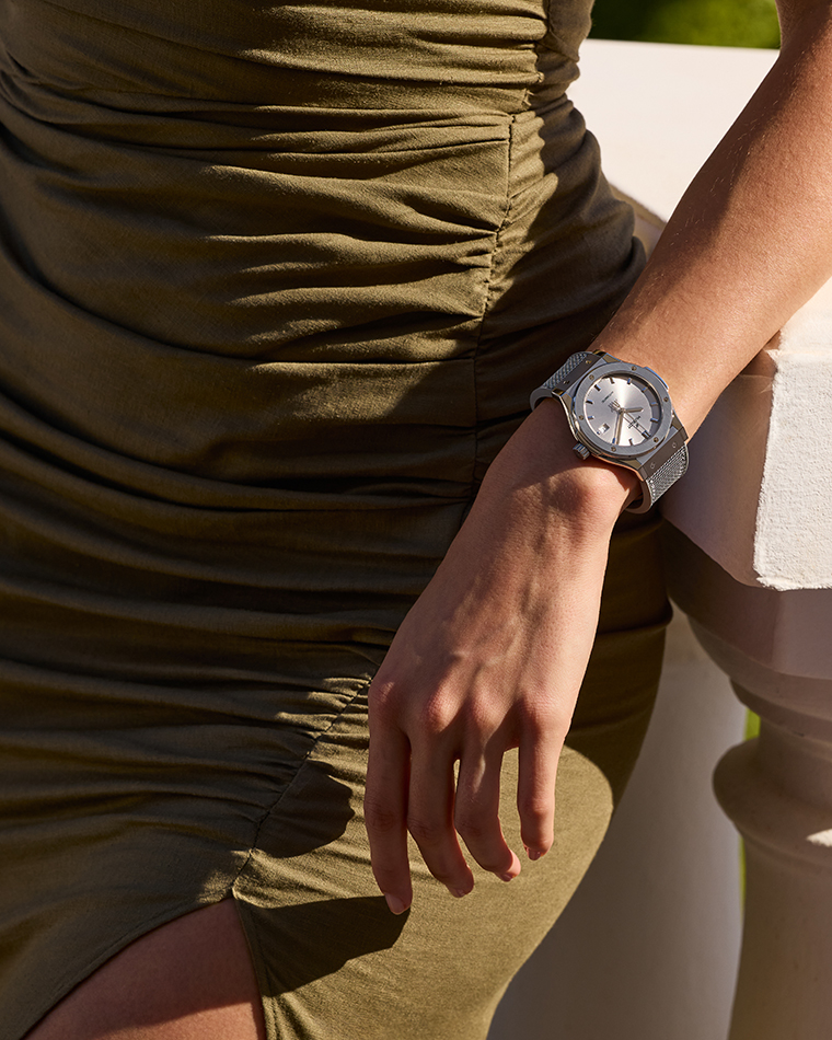 Classic Fusion Essential Grey ทั้ง 2 ขนาด ได้รับการรังสรรค์ตัวเรือนขึ้นจากไทเทเนียมโทนสีเทา ที่ยังคงไว้ซึ่งการออกแบบที่เป็นเอกลักษณ์ โดยพื้นผิวขัดแต่งเป็นลายเส้นซาตินแนวตั้ง ร่วมด้วยการขัดจนขึ้นเงาผสมผสานกันอย่างลงตัว โดยมีขอบเบเซลวงกลมยึดด้วยสกรูขัดเงารูปตัว H จำนวน 6 ตัว ยึดเอาไว้ทั้ง 6 จุด ด้วยระยะห่างที่เท่าๆกัน รวมถึงบนข้อต่อสายแบบ Hooded Lugs อีกข้างละ 2 จุด และทนต่อแรงกดดันของน้ำได้ 50 เมตร กระจกหน้าปัดคริสตัลแซพไฟร์เคลือบ AR กันแสงสะท้อน เผยให้เห็นหน้าปัดสีเทาคมชัดที่สะท้อนประกายงามหรูอันเกิดจากการขัดผิวแบบซันเบิร์สต์ โดยทั้ง 2 รุ่น มีองค์ประกอบเลย์เอาท์และการตกแต่งแทบจะเหมือนกันทุกประการ โดยใช้มาร์คเกอร์ทรงแท่งผิวเงางามที่ผ่านการตัดแต่งเป็นมุมจั่ว พร้อมด้วยเข็มทรงบาตองปลายแหลมซึ่งแสดงการบอกเวลาเป็นชั่วโมง นาที และวินาที ซึ่งเข็มวินาทีถูกออกแบบให้ยาวเรียวและมีปลายถ่วงเข็มเป็นโลโก้ของ Hublot ส่วนฟังก์ชันวันที่จัดวางอยู่ภายในช่องกรอบสี่เหลี่ยม 3 นาฬิกา ซึ่งทำแผ่นวงแหวนวันที่เป็นสีเทาอย่างกลมกลืน