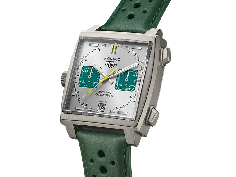 TAG Heuer Monaco Chronograph Racing Green กสานต่อมรดกทางการแข่งขันของ TAG Heuer และเป็นบทที่สองในเรื่องราวของ Racing Monaco โดยเข้าร่วมกับคอลเลกชัน TAG Heuer Monaco เพื่อเฉลิมฉลองให้กับเหล่ารถแข่ง และลวดลายสีสันอันเป็นเอกลักษณ์ของรถเหล่านั้น โดยครั้งนี้เป็นการให้เกียรติกับสีอันเป็นสัญลักษณ์ของอังกฤษ