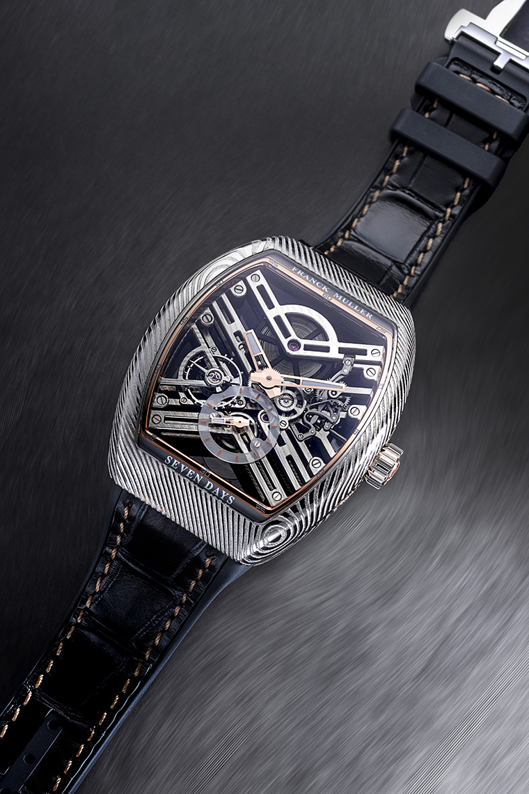 โดยทั้งตัวเรือน กลไกแบบสเกเลตันทั้งหมด เม็ดมะยม และหัวเข็มขัดสายนาฬิกาของ Vanguard Damascus Steel Sincere Platinum Jubilee Edition ผ่านการตัดอย่างละเอียดอ่อนจากบล็อกเดียวกันของดามัสกัส สตีล ด้วยเครื่องจักร ซีเอ็นซี (CNC) ภายในโรงงานการผลิตของแบรนด์เอง ทำให้เรือนเวลาแต่ละเรือนนั้นมีลวดลายริ้วเส้นเฉพาะตัว ซึ่งเผยหลังผ่านกระบวนการแช่ในน้ำกรดอันแม่นยำและควบคุมการผลิตภายในโรงงานของ Franck Muller เช่นเดียวกับการแช่กลไกสเกเลตันลงในน้ำกรดซึ่งจำเป็นต้องควบคุมด้านเวลาอย่างเข้มงวดและระมัดระวัง โดยใช้เวลาเพียงสองถึงสามนาทีเท่านั้น เพื่อหลีกเลี่ยงการเปลี่ยนรูปหรือการหดตัวของวัสดุ