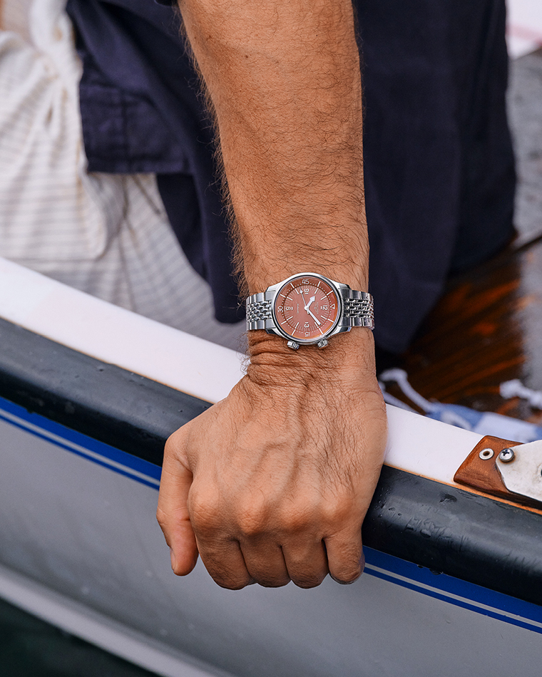 โมเดลใหม่มาพร้อมกับสายรัดข้อมือสแตนเลสสตีลที่มีข้อต่อแบบ “grains-of-rice” อยู่ตรงกลาง มอบความยืดหยุ่นและความสบาย สายรัดนี้มีกลไกการล็อคแบบพับได้สองชั้น พร้อมการปรับขนาดได้ละเอียด