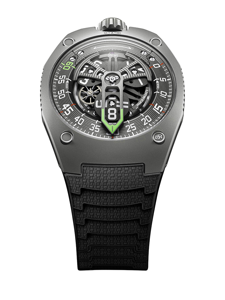 UR-150 มาพร้อมกับเข็มโอเพ่นเวิร์คขนาดใหญ่ซึ่งทำหน้าที่บอกเวลาปัจจุบัน ผ่านปลายเข็มโค้งเหนือแทร็คนาที เมื่อครบ 60 นาที เข็มจะกระโดดตีกลับไปยังตำแหน่งศูนย์และเริ่มต้นนับเวลาใหม่ ในขณะเดียวกันการแสดงเวลาชั่วโมงระบบดาวเทียมจะหมุนรอบแกน– โดยการเปลี่ยนแปลงจะเกิดขึ้นภายในเวลาเพียง 1/100 วินาที