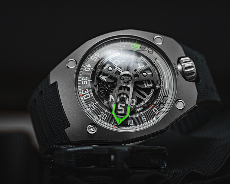 ภายในตัวเรือนนาฬิการุ่นใหม่ล่าสุดนี้ URWERK ได้ติดตั้งกลไกการแสดงเวลาชั่วโมงดาวเทียมที่พัฒนาขึ้นอย่างล้ำสมัย โดย UR-150 มอบประสบการณ์ที่น่าตื่นเต้นเมื่อเวลาชั่วโมงเปลี่ยนผ่านอย่างโดดเด่น “เหมือนกับการสั่นสะเทือนในสเปซไทม์อย่างต่อเนื่อง” Martin Frei กล่าวเสริม “ช่วงที่เข็มตีกลับนั้นมีความพิเศษมาก เราสูญเสียหรือได้เวลากลับคืนมาหรือไม่? สำหรับ URWERK ชื่นชอบในช่วงเวลาที่รอคอยและเฝ้ามอง – ซึ่งดูเป็นธรรมชาติ ขณะที่เข็มนาทีเดินไปอย่างช้า ๆ ไม่มีมาตรแสดงค่าวินาที และเข็มนาทีจะตีกลับไปยังจุดเริ่มต้นอย่างรวดเร็วอีกครั้ง