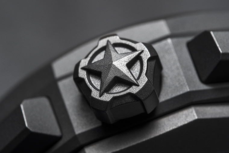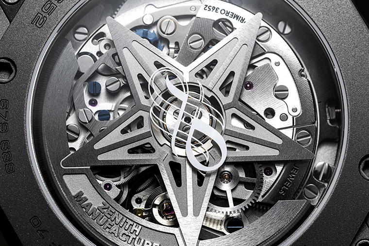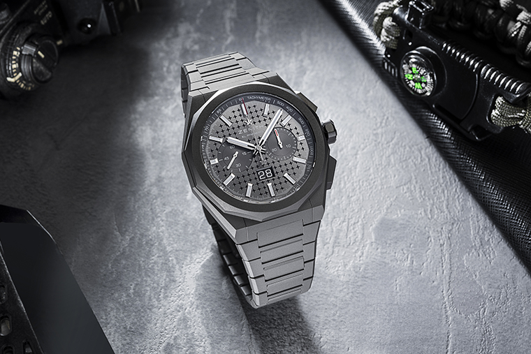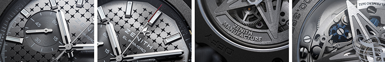 โทนสีเทาเข้มของไทเทเนียมช่วยเสริมให้นาฬิกาดูมีความเป็นธรรมชาติ และกลมกลืนเป็นชิ้นเดียวกัน ขณะที่สเกล Tachymeter (ทาคีมิเตอร์) ที่มีรูปทรงเป็นวงแหวนในขอบหน้าปัดนั้นสอดรับกับรูปร่างของขอบหน้าปัดแบบสิบสองเหลี่ยมได้อย่างลงตัว การสร้างสรรค์ด้วยการเลือกใช้โทนสีแบบโมโนโครม นอกจากจะสัมผัสได้บนตัวเรือนแล้ว ยังเสริมด้วยหน้าปัดลายซันเบิร์สต์เคลือบซาตินในสีเทาเมทัลลิกที่เข้ากัน บนพื้นหน้าปัดมีการสลักด้วยดวงดาวที่ประดับอยู่บนท้องฟ้ายามค่ำคืน การออกแบบนี้ได้รับแรงบันดาลใจจากสัญลักษณ์รูปดาว ZENITH แบบ “Double Z” ที่พบในนาฬิกาข้อมือ DEFY รุ่นแรกๆ ในปี 1969 ซึ่งเป็นการเชื่อมโยงอดีตและปัจจุบัน อีกทั้งยังเป็นการยกย่องทั้งมรดกทางนาฬิกาของ ZENITH และการเดินทางสู่ความเป็นเลิศของ Sincere